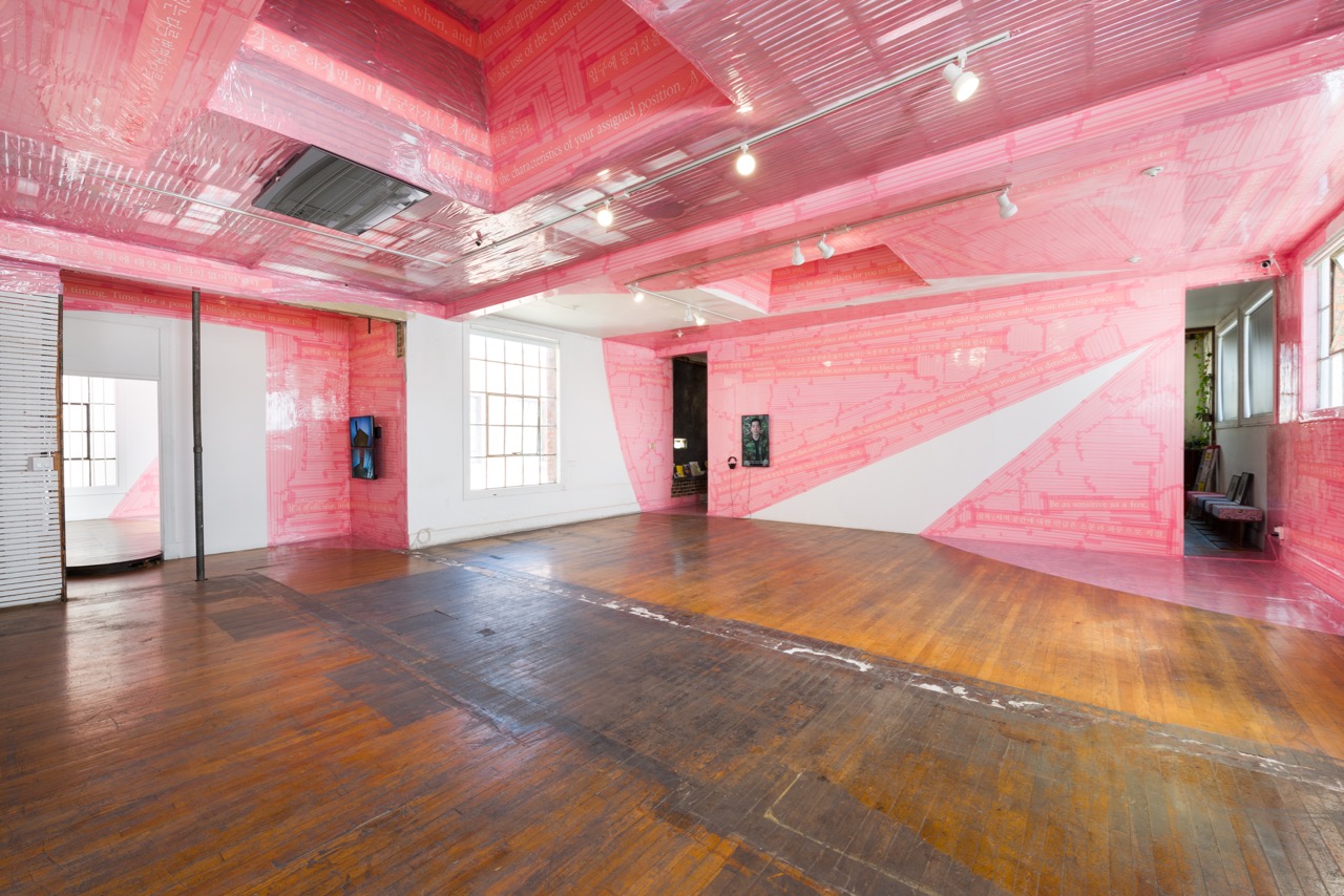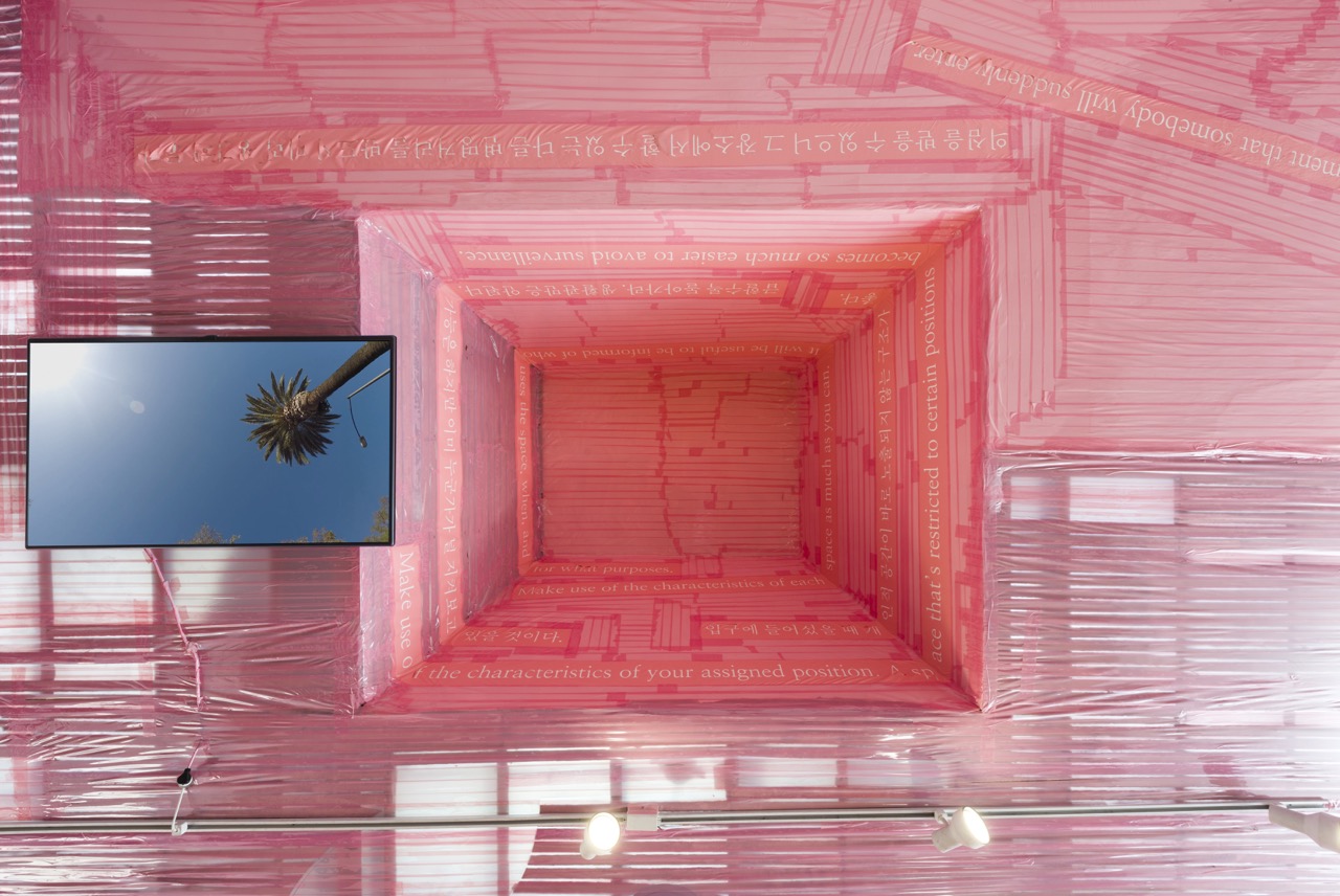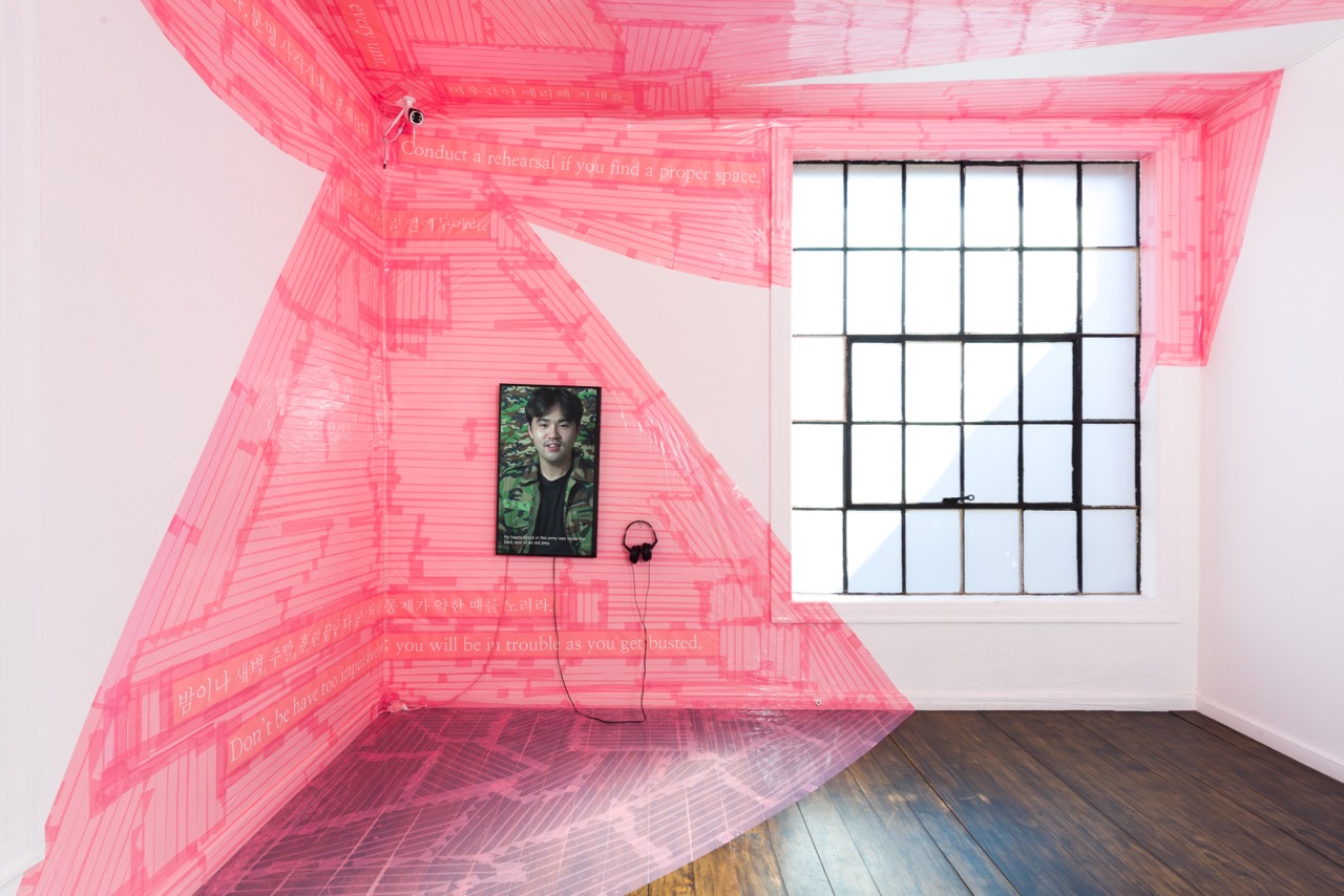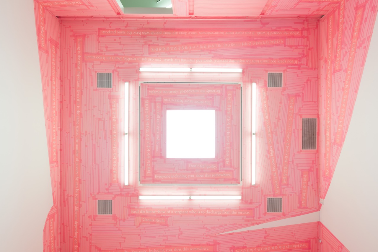 Excerpts from the interviews in Korean and English are rendered in vinyl wall lettering in a similar gauzy peach/pink that is interwoven into the tape throughout the installation. Instructions and advice range from practical (Be ready for the moment that somebody will suddenly enter) to sanguine (Observe. There are patterns in the military. The answer is in the limited space and timetable) to pithy and oblique (Genius steals. Steal the know-how of a sergeant about to be discharged from his service) to commiserative (Don’t feel guilty. Everyone, including you, does this somewhere).