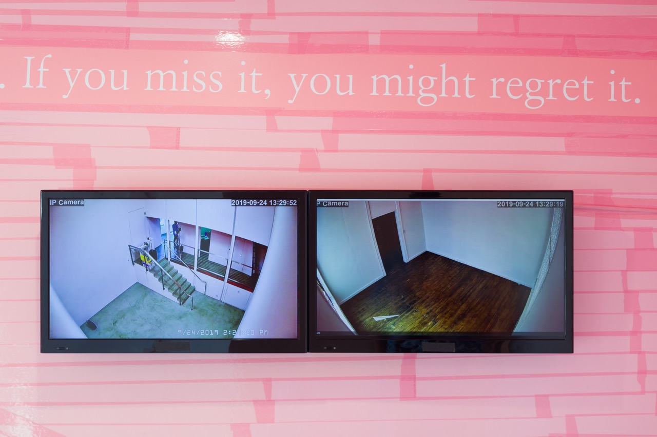 The pink tape is one component of the site-dependent Reciprocal Viewing System (2014–ongoing), which in this iteration pairs monitors at the entrance of both exhibition venues, displaying live-feed surveillance footage from cameras in situ within the galleries and at the partnered site synchronously. It’s a quick double take before the logic of the work reveals itself: the pink tape is not at all visible on the feed; it falls outside the camera’s limited field of vision. Tape can mask, but in this case, it also reveals that which the cameras do not see, reminding us by extension of the blind spots of similar tools of panoptic authority and control. Privy to the mechanics of the setup and the architectural intervention, we not only see and are seen alongside others, but can also slip in and out of view, at will. This capacity affords some respite, in our time of ever-higher-res Internet Protocol cameras, those armed with night vision, AI, and facial recognition software, when it can feel as if we are just hanging on to our civil liberties.