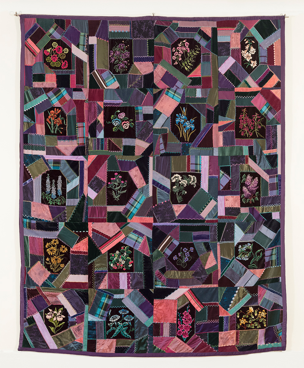 Jane Kaufman, Embroidered, Beaded Crazy Quilt, 1983–85. Embroidered thread and beads on quilted fabric, 94 × 82 inches. Courtesy the artist. Photo: Joshua Nefsky.