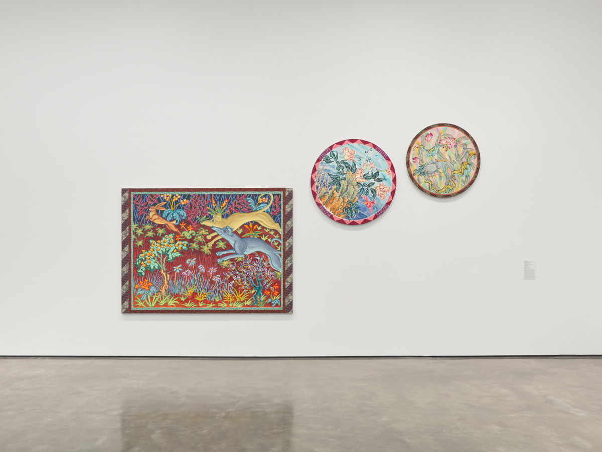 With Pleasure: Pattern and Decoration in American Art 1972–1985, installation view. Courtesy Hessel Museum of Art, Center for Curatorial Studies, Bard College. Photo: Olympia Shannon. Pictured, left to right: Brad Davis, Rabbit + Two Dogs = Desire, 1979; Top of the Peak, 1980; Bird & Lotus Tondo #4, 1979.