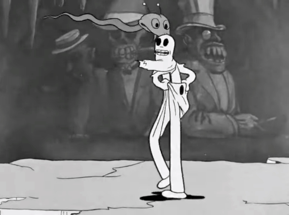 Music is literally what gives this animation its motion—characters run, bob, waltz, twirl, bounce, swell, shrink, transform, hoot, holler in time with the soundtrack, perfectly synched by a device called the “cue-meter.” It also signals the transitions between different spheres of being: when you hear that wah-wah of the trumpet with its stem-in Harmon mute, or the minor-keyed chorus of horns, you know a dark evolution is about to take place. In Betty Boop: Snow White, these sounds usher in Koko’s mesmeric song, which tells of his baby stretched out on a long white table / She so sweet, so cold, so fair, and imagines his own funeral, the details of which in turn act upon his animated body. Bury me in my straight-leg britches, for instance, sees a pair of ghostly trousers run down Ko Ko’s flexile legs, sliding all the way to the ground, only to be pulled back up by an extra pair of hands sprung from beneath his tattered shirt. When the pants reach his shoulders, a pair of eyeballs pop into Koko’s previously hollow sockets, rolling gleefully.