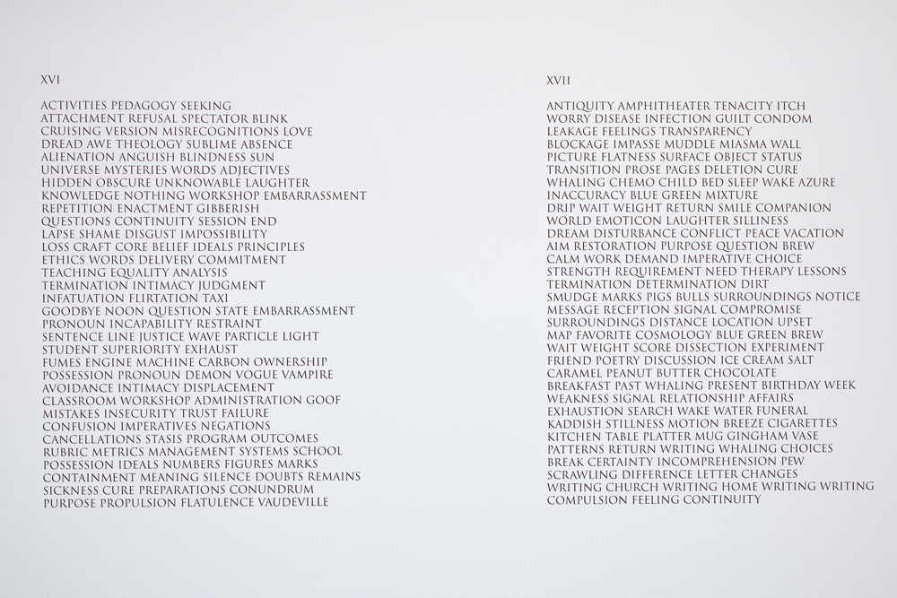 Which is to say, in a way, that we search for meaning amidst a vast wreckage. Debris Fields (2025), a poem in twenty-four parts, elapses across the four walls of the hallway. Neatly applied in black vinyl letters, ALL CAPS and serif typeface, each text (except for the twenty-fourth) is thirty-two lines; each line is ten syllables, all nouns. Each stanza is eighty by one hundred centimeters, even and regular, but inside this visual rigor the language toils and teems, funny and weird, associative and clear, errant and painful, moving and memorious, always surprising. (I was reminded of Jenny Holzer’s 1979–82 Inflammatory Wall, whose likewise formal clarity, which nods to dry conceptualism, is unsettled by its feverish content; and Robert Smithson’s 1966 drawing A heap of Language, in which his curving script erects a gently sloped pyramid of words.) Person, place, thing—the noun is virtually inexhaustible. In Debris Fields, the chosen ones tell us as much about language in general as language in particular, how it speaks to one’s exterior and interior—a world in every word—alike. But which are the fields and which is the debris?