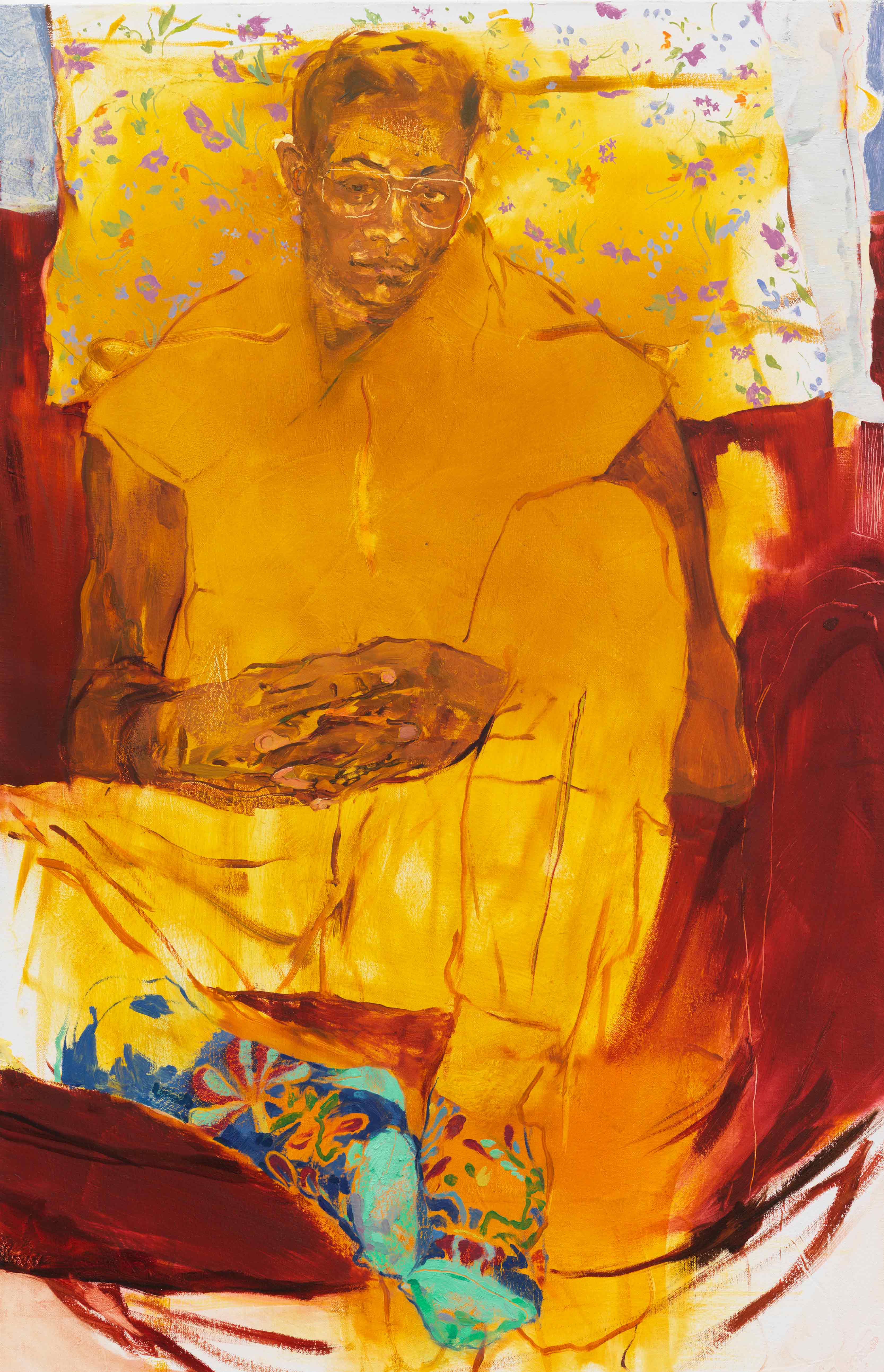 I am transfixed by Tia’s hands, which sit folded in her lap, flickers of rose, salmon, watermelon pink for nails. Tia’s feet, sole of right resting against arch of left, her patterned socks with their turquoise toes and bright floral sprays of orange, crimson, yellow, indigo. The pillow case behind Tia’s head, flowers again, smaller and more delicate, purple, pink, periwinkle, green leaves and stems scattered across white, Tia (2017). Hands, again, in Jess (2018), gently folded in the lap, again, their painted lines energetic, elastic, careful, as in full of care, one fuchsia nail throbbing quietly among the rest, a smudge of violet on the knuckle. In Tobi (2019), a vision in magenta, legs drawn to his chest, bare feet snag the eye. Modeled with the merest of dark lines, the flesh of Tobi’s feet is rendered in swathes, patches, dabs, smears, scrapes of ruby, cerise, fandango, bubble gum, carnation pink. A topography of tenderness and solitude—the heat of a body in quiet repose—existing, being seen. Look closely: peeking from beneath the cushion on which his feet rest is another pair of feet, half-sketched but identical. A different version, a previous possibility, the multitudes of a body? Jennifer Packer’s portraits hold time, reveal its passing and their making within it.