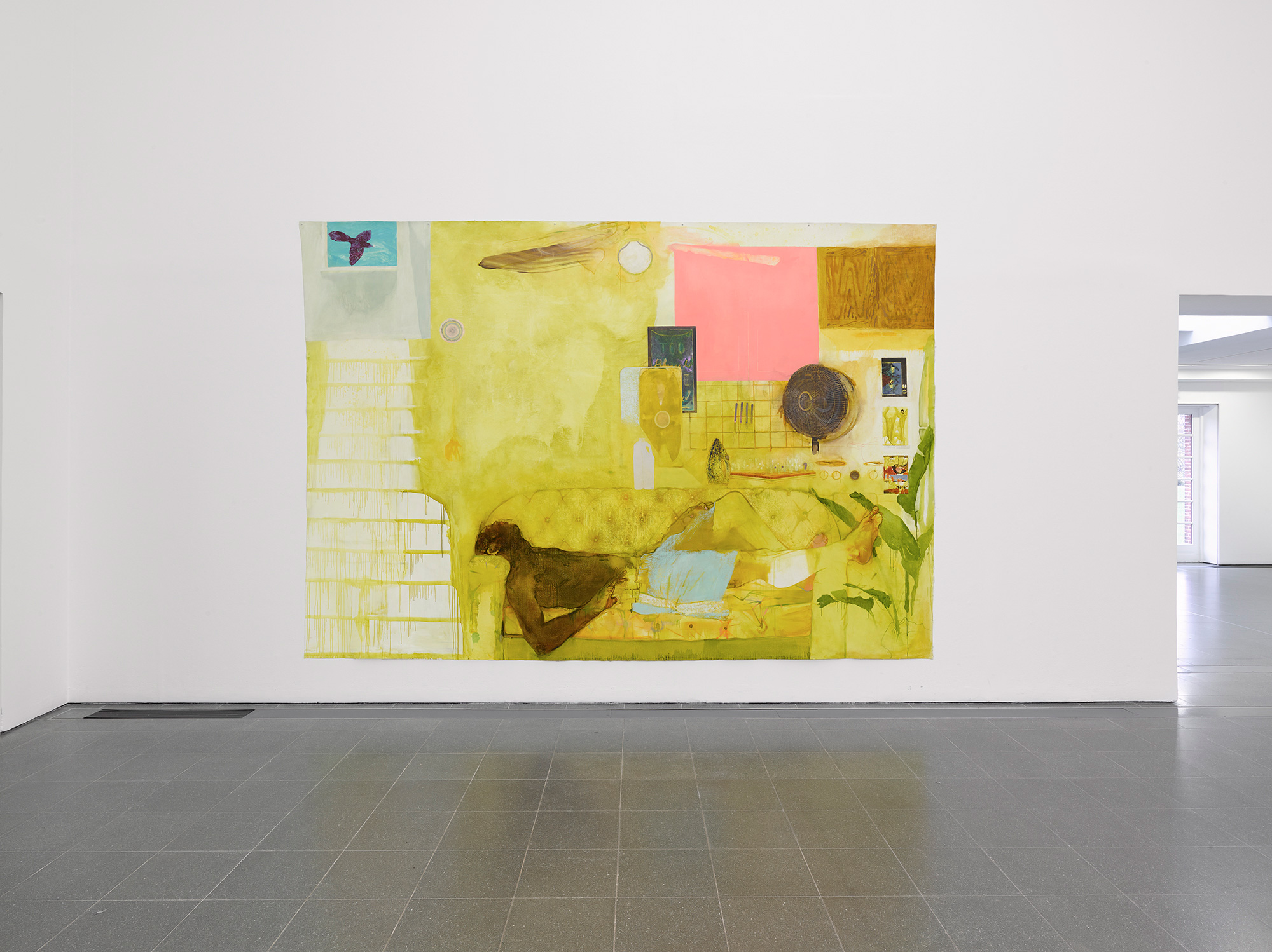 Two of the largest works at the Serpentine are composite domestic scenes, assembled from parts observed, remembered, and imagined. Fire Next Time (2012), a reference to James Baldwin’s 1963 book, is suffused with hot hues of orange. A man slumps over a slender counter, legs splayed beneath, around him a scene of discordant geometries—a ladder, stairs, a plump hunter-green chair, a flower pot, a milk crate—is rendered in different treatments of paint, impressionistic, drawn, poured, dripping, as though the time and space of the painting have been flattened and collapsed. Blessed Are Those Who Mourn (Breonna! Breonna!) (2020) is similarly constructed around a figure in repose on a couch in the foreground. The image is dominated by an almost hallucinatory field of chartreuse, punctured here by a large square of pink, there by a window of sky blue framing a wine-colored bird in flight—a picture within a picture. Another picture within the picture is a poster, partly covered by a square fan, that reads Too Blessed to Be Stressed in curly and joyful colored script decorated with illustrated party bunting—a poster that hung in twenty-six-year-old Breonna Taylor’s bedroom when she was murdered by police on March 13, 2020.