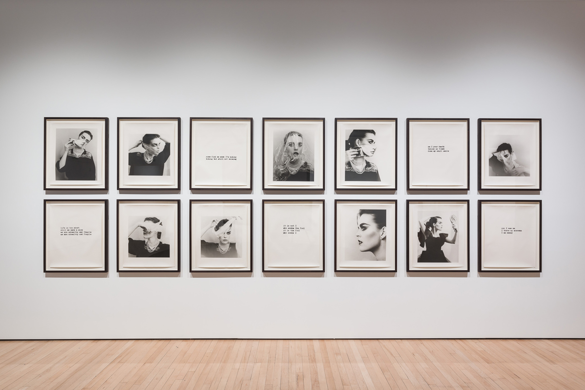“I have always treated myself as a found object,” Linder has said, a proposal that in her practice allows for, rather than objectification, transformation. In the second of four rooms, Linder herself becomes a tool for manipulation within images. In the wonderful She/She (1981), the artist appears in a series of black-and-white portraits that hang—alternating with lyrics from a song by her band at the time, Ludus (the show takes its title from one of their albums)—in a grid configuration. She drapes paper and cellophane over her head at various angles, as if collaging her own visage, choosing what to obscure or exaggerate. In one photograph, she holds up a torn image of a model’s face, almost seamlessly replacing the lower half of her own. Linder is and is not the torn image, is and is not herself, is and is not one-dimensional, three-dimensional, somewhere in between: “am I your death / behind my flesh / does my skull smile,” the unsung lyrics ask, without a question mark.