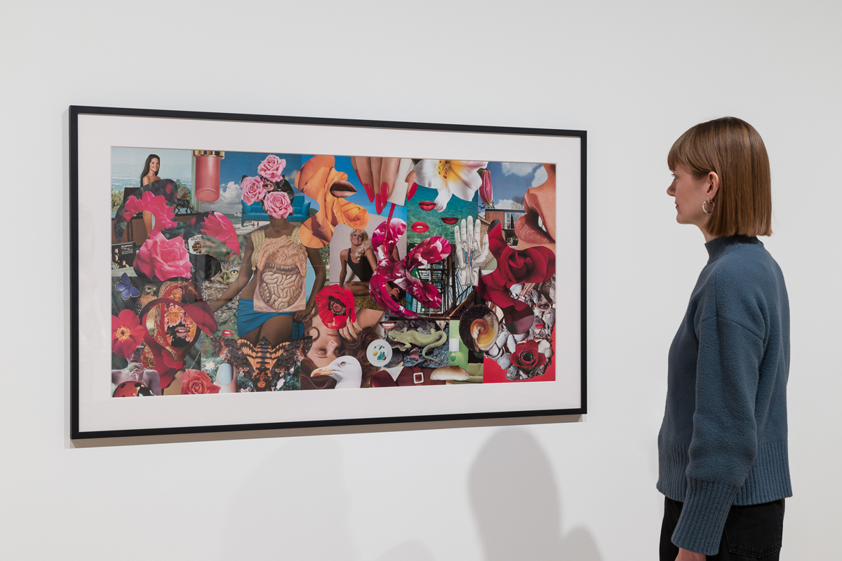 Linder’s sensibility, though, is stranger, more uncanny, luscious, illicit, disturbing, sexy, irreverent, and—what else to say but—punk, since she was, frankly, an epic one. Attending art school in Manchester in the mid-1970s, she described the genre, with its love of provocation, as arriving practically overnight: “punk was emerging in the summer of 1976 and by the spring of 1977 it had already made it into my mother’s copy of Woman’s Realm, with articles on how to knit your daughter a mohair jumper and make a binbag skirt.” (Perhaps Woman’s Realm was, like Linder’s grandmother’s favorite magazine, True Confessions, also a source for her collage materials.) Works from this time are all anarchically “untitled,” a rejection of the fine in fine art. Many take aim at the dehumanization of women, but it is perhaps romance that is exposed as the biggest fakery of all. (“Tell me about it,” I overheard one viewer say, looking at a picture of a woman with a cupcake for a head and a man with a toothy grin attached to his crotch, like some inverse vagina dentata.)