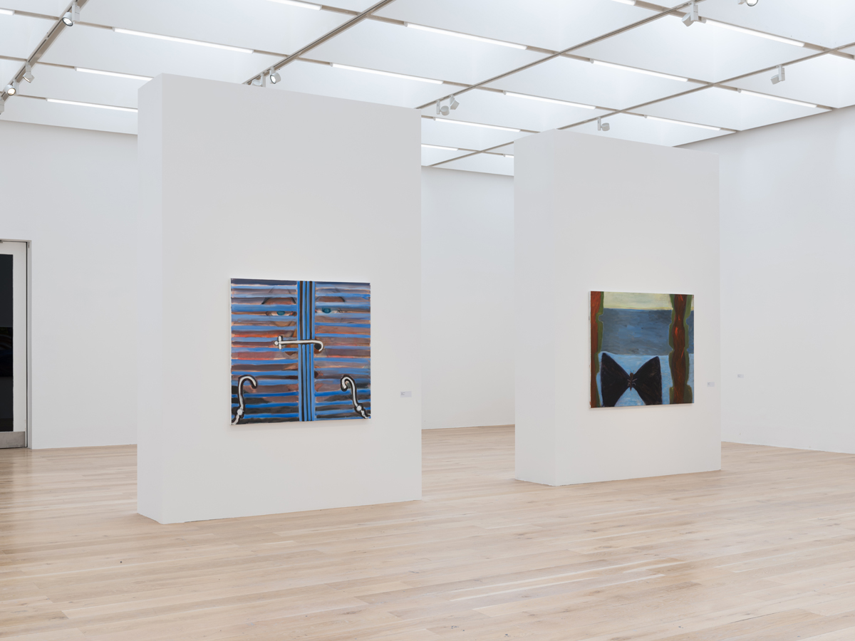 In the second work, the cobalt-blue shutters are closed with a white latch outlined cartoonishly in black, with two additional white latches (“shutter dogs” is the technical term for these architectural implements used to keep the coverings open) that curl up from the corners like question marks about what is underway. Beyond the slightly parted slats looms a giant fleshy face, with rosy cheeks and watery blue eyes, peering directly into what might be the painter’s room, but here is the gallery in which we stand. How big is this person? (How small is this window?!) Who is it and what do they want? Have we caught the slats mid-open or -close? In Nashashibi’s art, narrative detail matters less than the evocation of atmosphere, sensibility, and mood.