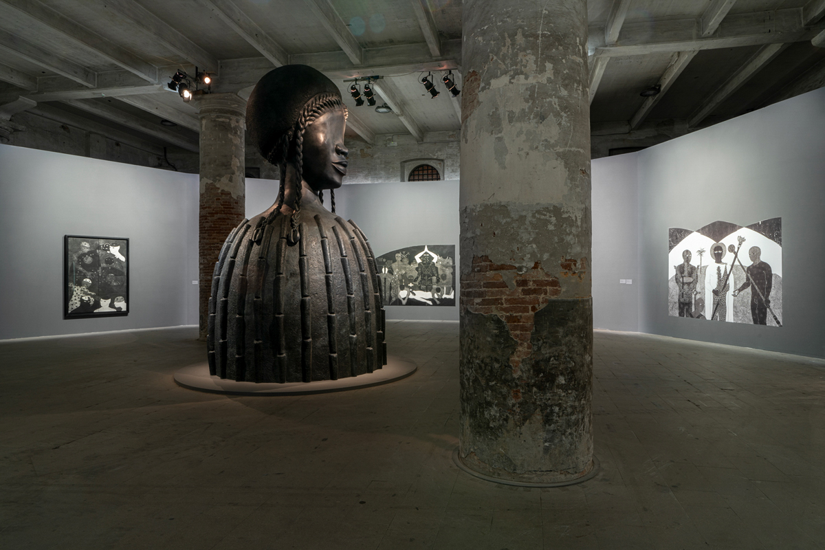 The Milk of Dreams, installation view. Courtesy La Biennale di Venezia. Photo: Ela Bialkowska. Pictured, foreground: Simone Leigh, Brick House, 2019. Bronze. Pictured, back walls: works by Belkis Ayón.