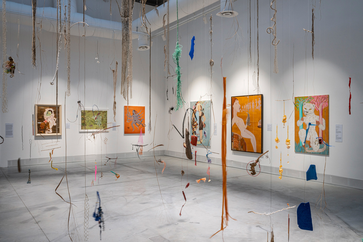 This formula of wall-based works (largely painting) plus sculpture—mirrored forms and themes—carries on throughout the exhibition and is at times repetitive and obvious. The Milk of Dreams is at its most thrilling when it is non-illustrative, when recurrent motifs and metaphors of becoming are troubled and complex, and when the works offer experiences rather than examples of metamorphosis and possibility. For, when we conceive of self-transformation via union with objects or technologies, surely this includes encounters with art? I was drawn to pieces like Candice Lin’s Xternesta (2022), a kind of eccentric mixed-media laboratory that conjoins science with traditional medicine, art with ex-votos, sacred with profane; Shuvinai Ashoona’s colorful drawings, in which animals from the Inuit imaginary—the walrus, the platypus, the octopus—live alongside denizens of the North in their stark, prefab housing; Sandra Mujinga’s neon-green installation, Sentinels of Change (2021), whose titular textile forms hang heavy and ominous, neither human nor other; Kaari Upson’s Portrait (Vain German) (2020–21), ten amorphous portraits made of layered resin, urethane, and pigment—mauve, pink, blue, green, brown, yellow, thickly encrusted, ghostly; and Miriam Cahn’s vibrant, violent, sensual paintings—babies, fists, floating, fucking.