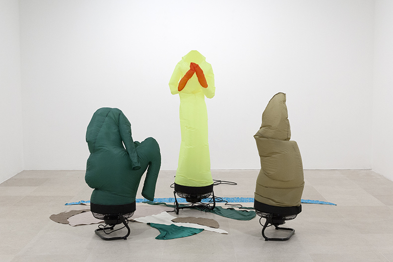 Paul Chan, Baigneurs Sans Rien, 2017. Nylon, fans, fabric floor piece, 71 × 120 × 70 inches. Image courtesy the artist and Greene Naftali.