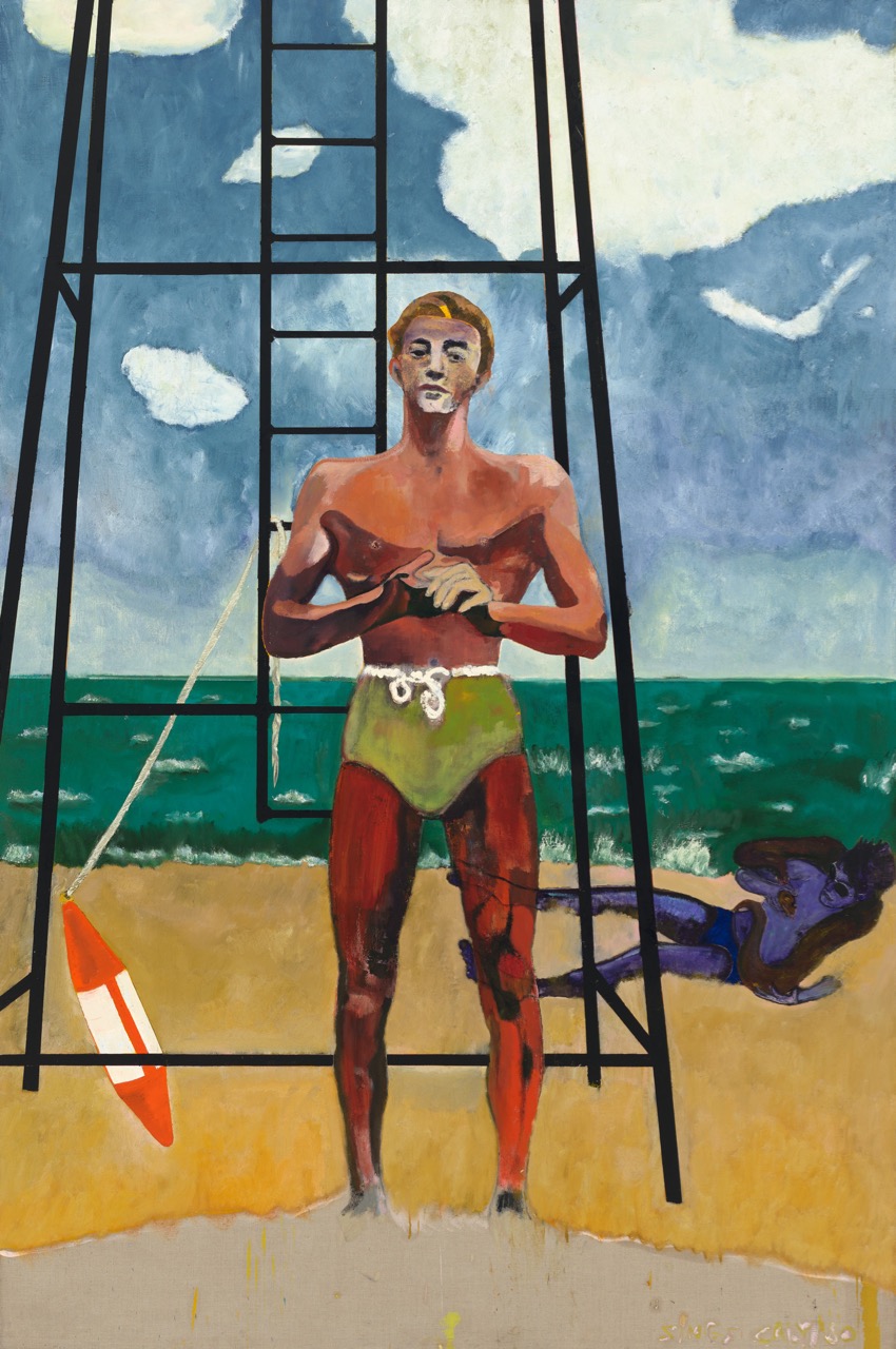 Doig has said that he expects his images to be bathed in an atmosphere of “blankness,” “mutedness,” “numbness.” And blank is the expression of the main character in the show’s second large painting, Red Man (Sings Calypso). The work depicts a beachside scene centered on a young man in a brief swimsuit, proudly and precariously standing in front of a gargantuan lifeguard’s chair, clutching his hands and presumably singing calypso (although his mouth is closed). He is the obvious protagonist of the piece, but we can’t take our eyes off another quasi-naked figure: a blue man, ignored by the singer, who grabs a writhing snake with both hands—a Laocoön without his children in a tropical resort. But his expression has nothing of the agony and terror of the classical statue, and there’s something humorous about his appearance, his careful hairdo and elegant sunglasses. We soon realize that we don’t even know if man and reptile are fighting or playing, if the serpent is the man’s enemy or pet.
