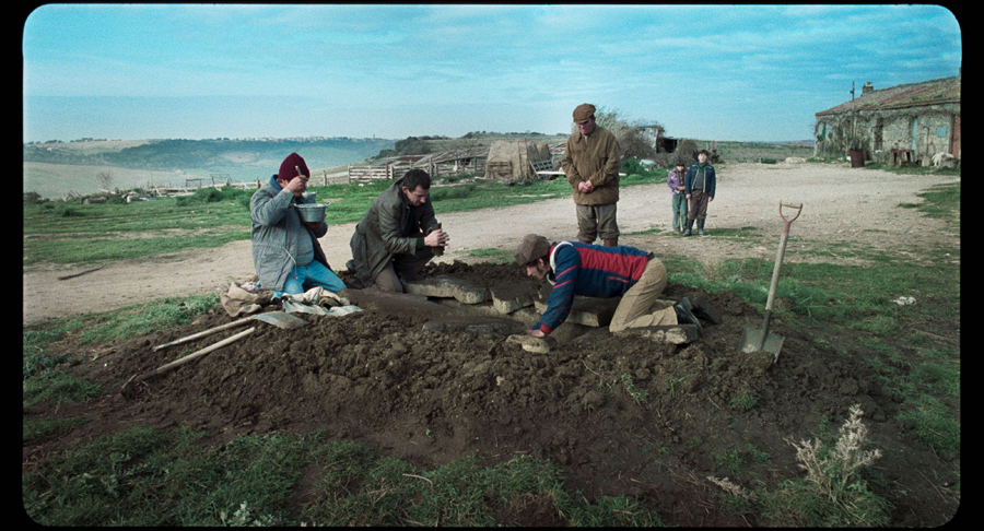 Along with Pirro, awaiting Arthur in Riparbella are the half-dozen cronies apparently connected to his jail time, a tin-roof shanty where he spends his nights, and Beniamina’s mother, Flora (a droll Isabella Rossellini), a black-lace-shrouded matriarch who lives in a crumbling villa, attended to by a chattering chorus of daughters and a woman named Italia (Carol Duarte), to whom Flora gives singing lessons in exchange for work as her servant. Stray English phrases betray Arthur’s British accent; Flora and others school him on Italian idiom, the words for tone-deaf and nosey parker. Flora and Arthur appear to conspire in the delusion of Beniamina’s eventual return; the terms of her vanishing and any question of Arthur’s involvement in it remain hidden, a thread the film is unwilling to pull. Instead, a series of capers ensue involving Arthur’s talent for hunting the unlovely landscape for buried treasure—in this case, the knickknacks and artifacts entombed with the ancient Etruscan dead. Using a dowsing rod, Arthur leads his crew to crypts that yield painted vases and other bits of pottery and ironwork. They bring the goods to a shadowy agent named Spartaco (played by Alba Rohrwacher, Alice’s sister), a black-market dealer who seeks to “estimate the inestimable,” invoking capital’s disregard for any value beyond that which the market will bear.