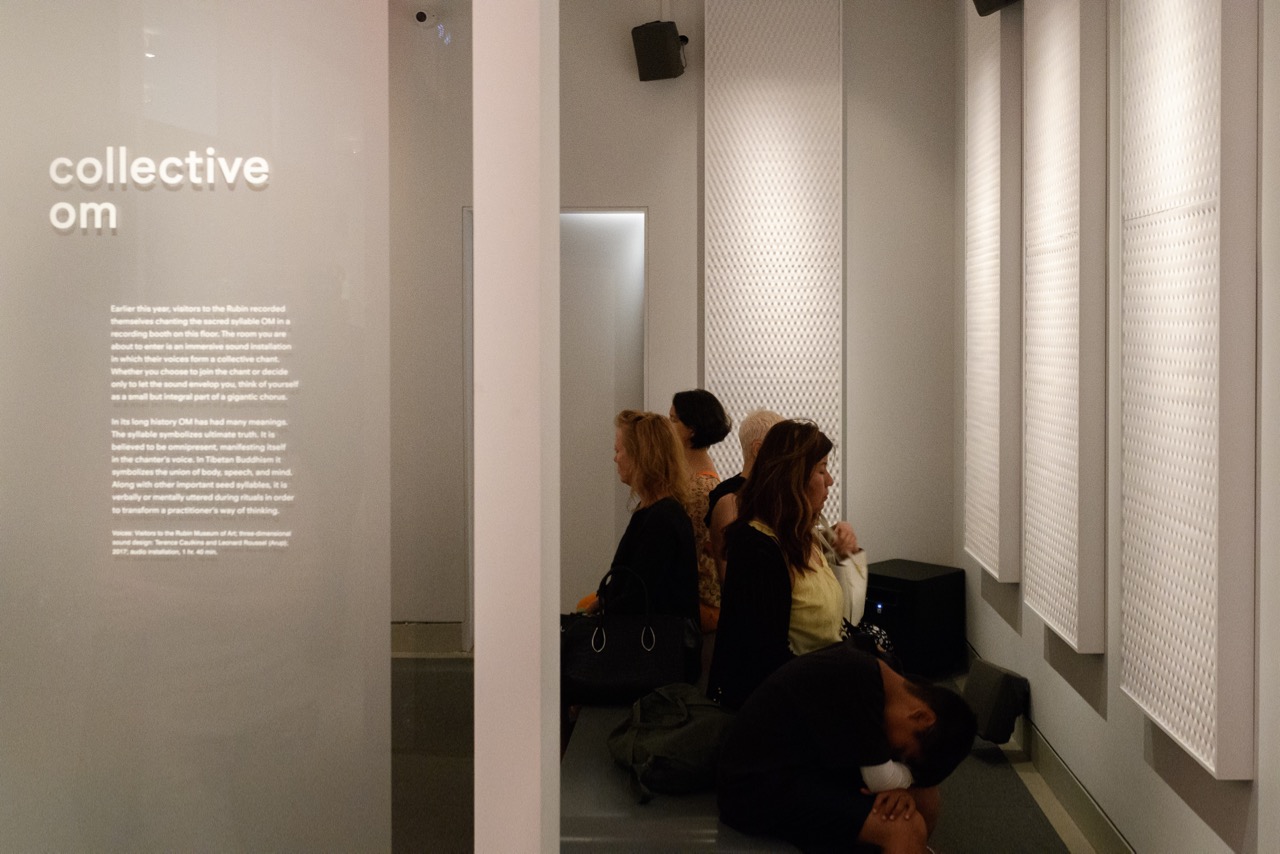 But Collective OM, the work that most completely cocoons the listener, curtailing the urge to do anything but listen, is also the most deflating. The installation was created by engineers at Arup from recordings of visitors chanting “om” at the Rubin earlier this year. Mellifluous voices fill a glass-enclosed room, which is stocked with plush ergonomic seating and superb speakers. The recordings have been refined and merged; individual voices seamlessly join and depart from the undulating chorus. After a minute of blissful surrender, however, I felt like I was participating in an experiment in crowd-sourcing communion. I wondered: What does my listening experience have to do with their (technologically mediated) chanting experience?