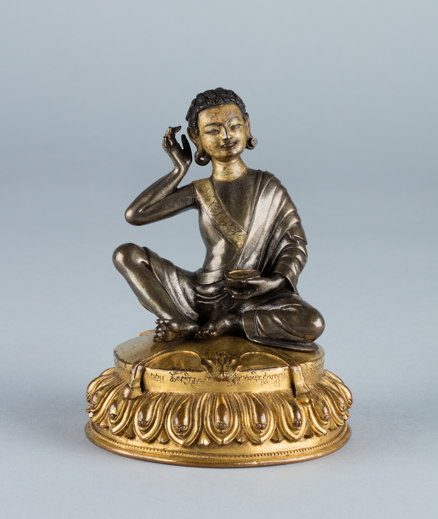 Milarepa, 15th–16th century. Parcel gilt silver with gilt bronze base, 5 ⅛ × 4 ⅛ × 4 inches. Image courtesy Rubin Museum.