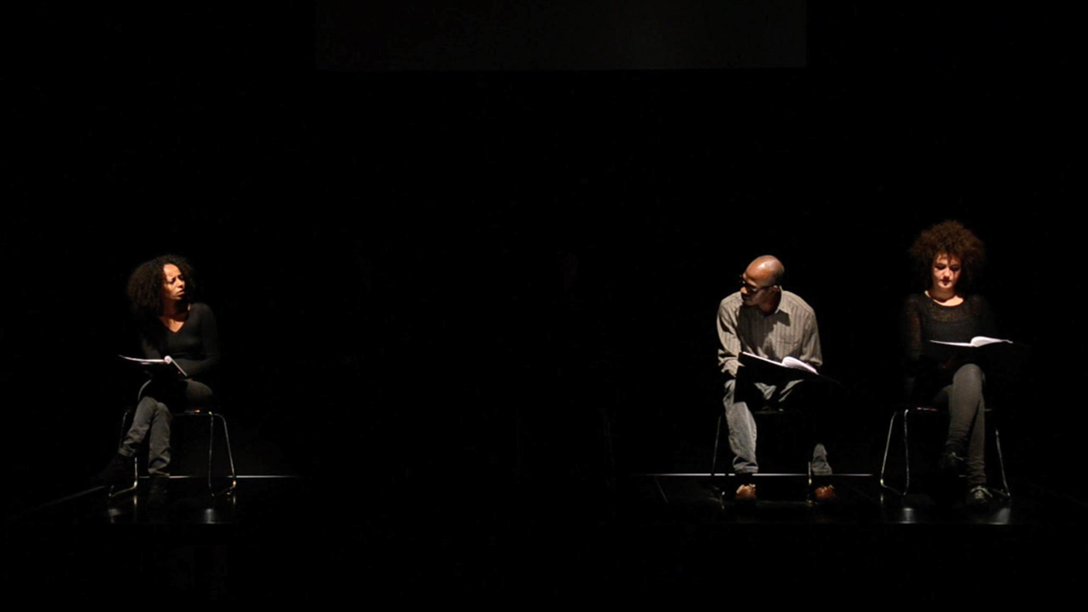 This kind of visual fragmentation, elaborate obstruction, or psychic interruption—which makes the viewer unable to take everything in—is a hallmark of the exhibition. In the second building, A World of Illusions (2017–19) is composed of screens sculpturally staged in a triangle in the center of the room. This film installation consists of three volumes—Narcissus and Echo (2017), Oedipus (2018), and Antigone (2019)—that adapt Greek mythology, cumulatively intervening in its cultural hegemony. Each volume comprises two channels, one large horizontal screen and one smaller vertical screen to its left (different sound emanates from speakers and headphones). An ensemble of Black actors performs, mimes, dances, and gestures on the larger screens. As if to marginalize the storyteller and the writer, each diminutive screen shows Kilomba reading, alternating between looking down at the script that radically reimagines truth and power and looking devotedly at the players on the larger screen next to her.