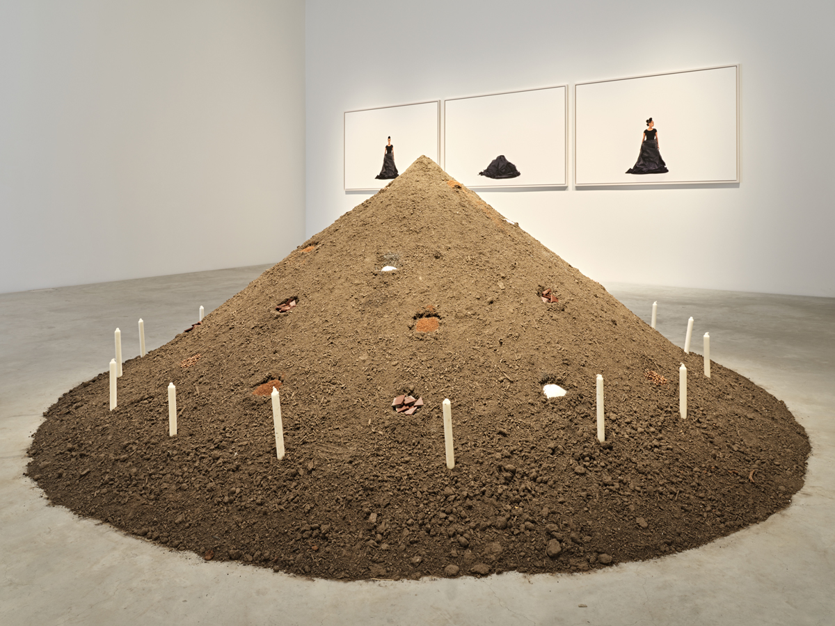 The image that still haunts me and who I really am is not Kilomba’s own, but one that she, as part of The Desire Project installation, appropriates and places in the middle of a white canvas. It’s an archival drawing of the African woman Escrava Anastácia, a venerated folk-saint figure in Brazil, where she was enslaved. Anastácia’s face, with her piercing eyes, is tiny, floating in the middle of a white expanse—though it’s not her face necessarily that I remember, but the way it is sealed shut, robbing her of speech. “THE MASK,” which appears on a second identical white canvas directly to the right, is an understated word to describe the brutal iron torture device that—by way of a bit clamped between jaw and tongue—fastens her mouth and spiders over her face. Hung around and over the canvas with Anastácia’s face is a long thin necklace with delicate white beads. The work operates like a shrine: to the left are more beaded necklaces—white, light blue, yellow, multicolored—white candles, a glass of water, a bowl of coffee, a pipe, and white lilies on two wooden stools. In the same room is an arresting installation, Table of Goods (2017), which is a sizable pyramidical burial pile of soil patterned with little circles of colonial commodities—chocolate, cocoa, sugar, coffee. Around the perimeter are unlit white candles, further suggesting mourning and grief.