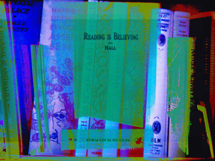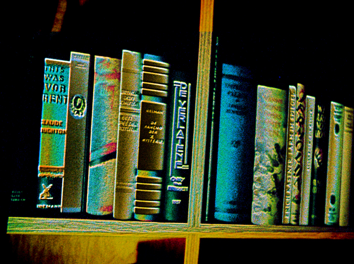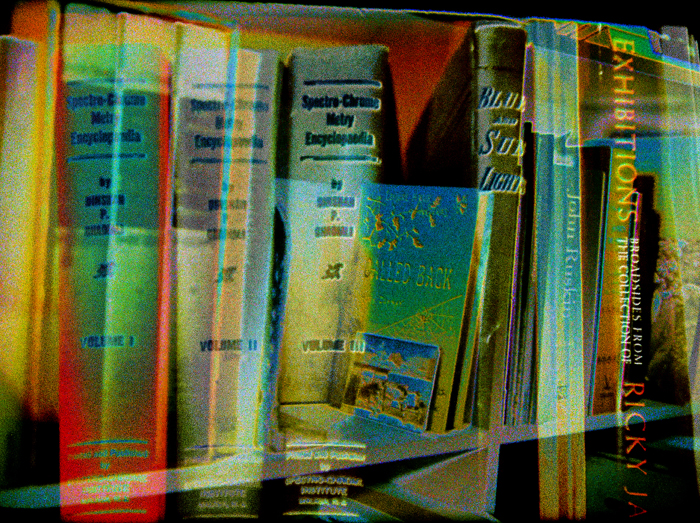 Preiss and McElheny have acknowledged the influence of Jorge Luis Borges’s short story “The Library of Babel” (1941), which offers a brilliant, brain-scratching disquisition on bibliotecas as conduits both of infinity and meaninglessness. I also found myself thinking of Arthur Fournier, in D. W. Young’s documentary The Booksellers (2019), who spoke of “the psychic dreaming that paper allows.” Like Pleasanton, like Ghadiali, the filmmakers focus on color and light, shooting individual book covers so that they recall a Fillmore East poster or Kenneth Anger’s Invocation of My Demon Brother. Old formats—VHS video, 35mm slides—are resurrected and then refilmed on a 16mm handheld Bolex camera to produce a temporal fugue. Burgin’s books are no longer physical objects; they’re on their way to becoming spirit dancers.