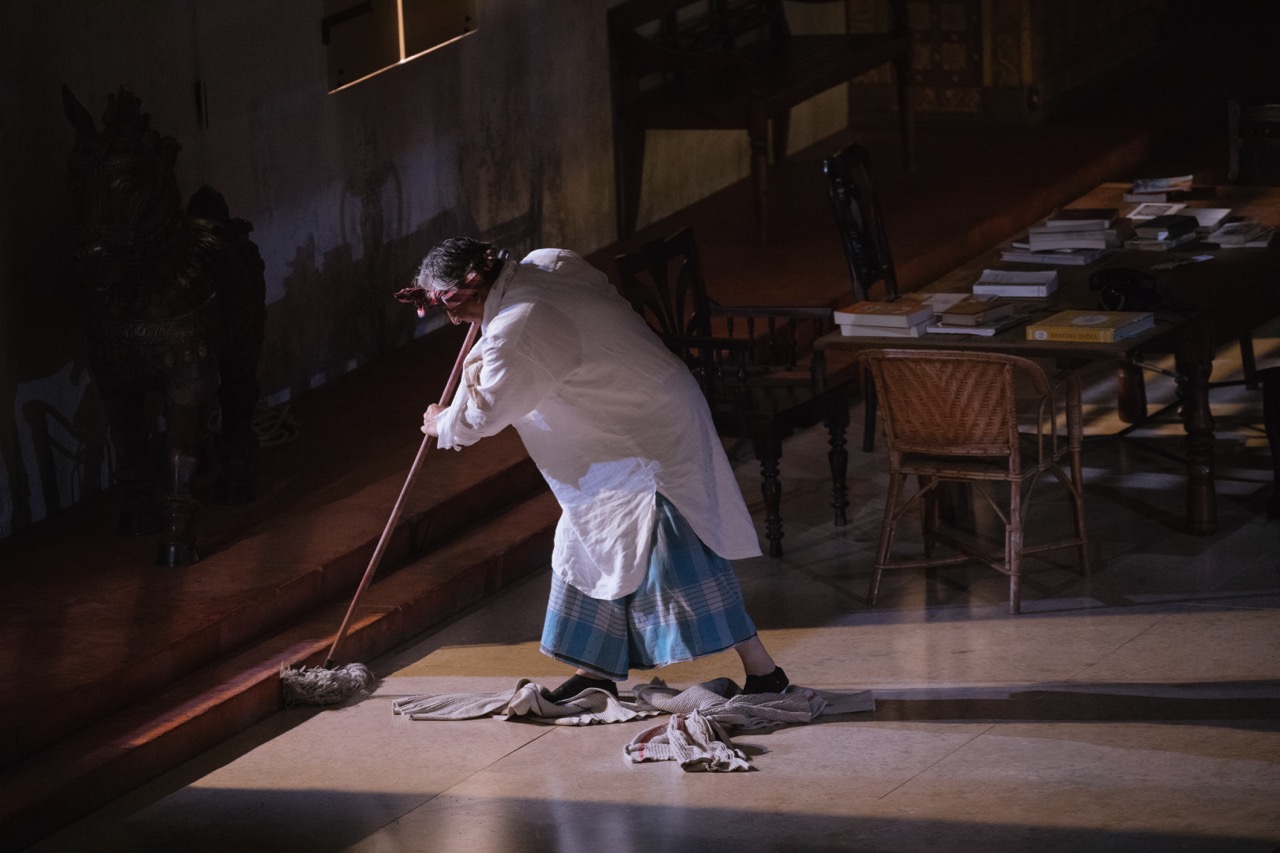 In her dreamscape, actors tumble in through the windows, and she fires at them with a machine gun. Suicide-vest-wearing baddies proliferate, and the room sometimes fills with smoke or a storm of newspapers. And whenever she says she hasn’t got any ideas, the fantasy cracks open and the Terukkuttu performers arrive—either the whole company rushing in for a production number, or one by one. (A king, his gold-and-red headdress as tall as a wedding cake, stamps his foot, then disappears into a billow of fog.) When she’s awake, realistic drama intrudes as well: the wonderful Nirupama Nityanandan plays Madam Murti, the troupe’s host, who’s trying to protect her housemaid from being sold into sexual bondage. In one moment, her exasperation at the company’s many mistakes cuts through the miasma of artistic paralysis: “You want to look at women in the Mahabharata? Why not talk to the women in India?”