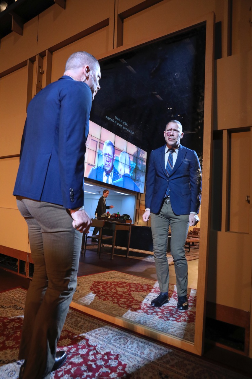 The sublime Hans Kesting plays “crook-back Dicky” with a birthmark on his face and a pinched-in but gleeful hobble. Our sense of time passing evaporates in his delight. “I am myself alone,” he says into a mirror, and he radiates happiness about it. He snatches up a rug to use as ermine; he makes the show’s musicians (trombonists playing full blast from a balcony) throw him a parade; he calls Barack Obama on the red phone. When the leonine Kesting begins his final titanic speech as Richard, all amplification drops away, the madrigals and horror-movie underscoring (composed by Eric Sleichim) stop. In the long night before his defeat on Bosworth Field, Richard seals himself up on the now-empty set, a Hitler in his bunker. He stares at his live video image, which morphs into the bodies of his victims. And in a final coup de théâtre, he rages at us with only a fluorescent bulb burning behind him. Mad Richard goes faceless in the black—he has turned into nothing but a shape in darkness. And yet the moment sears itself into you like it was something bright.