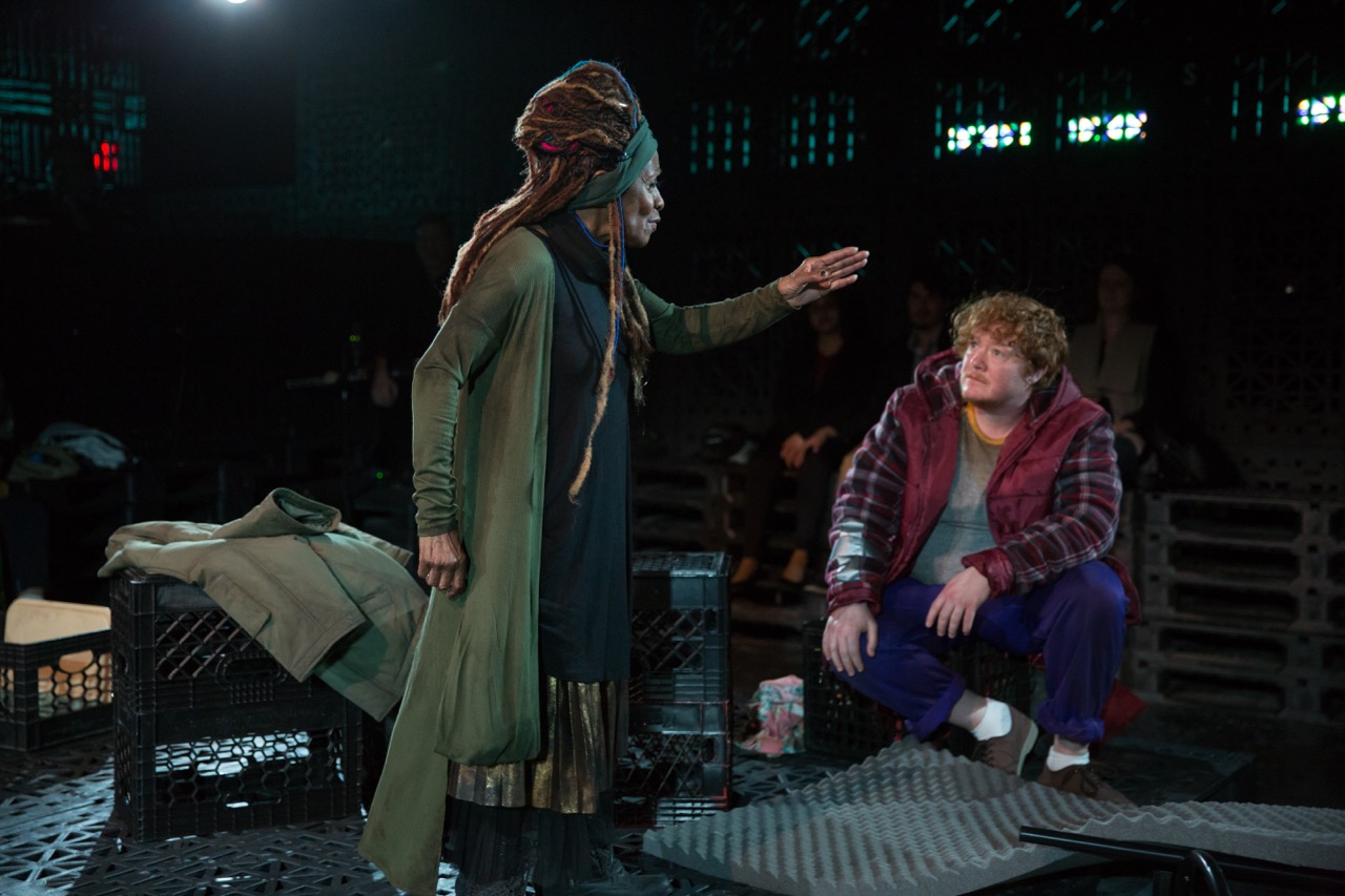 At the play’s start, we meet the youthful Messenger (Jasper Newell), who immediately runs afoul of his Supervisor (Roy Faudree). “Sirrah,” says the adolescent in stilted olden-timey talk, “I need to get paid. With whom do I speak?” Supervisor won’t pay up, but he’ll give the kid someone else’s IOU, so the Messenger heads out into the wild, trying to collect. He reaches his destination—it could be anywhere from Canada to some expressionist ur-frontier—where he duns the innkeeper Manan (Becca Blackwell). Manan’s dear companion the Drunk (Paul Lazar) has just severed their connection to civilization by tearing up their map, but after accidentally killing the Messenger (don’t do this), the two resolve to carry his body home to be buried—and they walk back out of the far reaches toward Samara, the city they’d left behind.