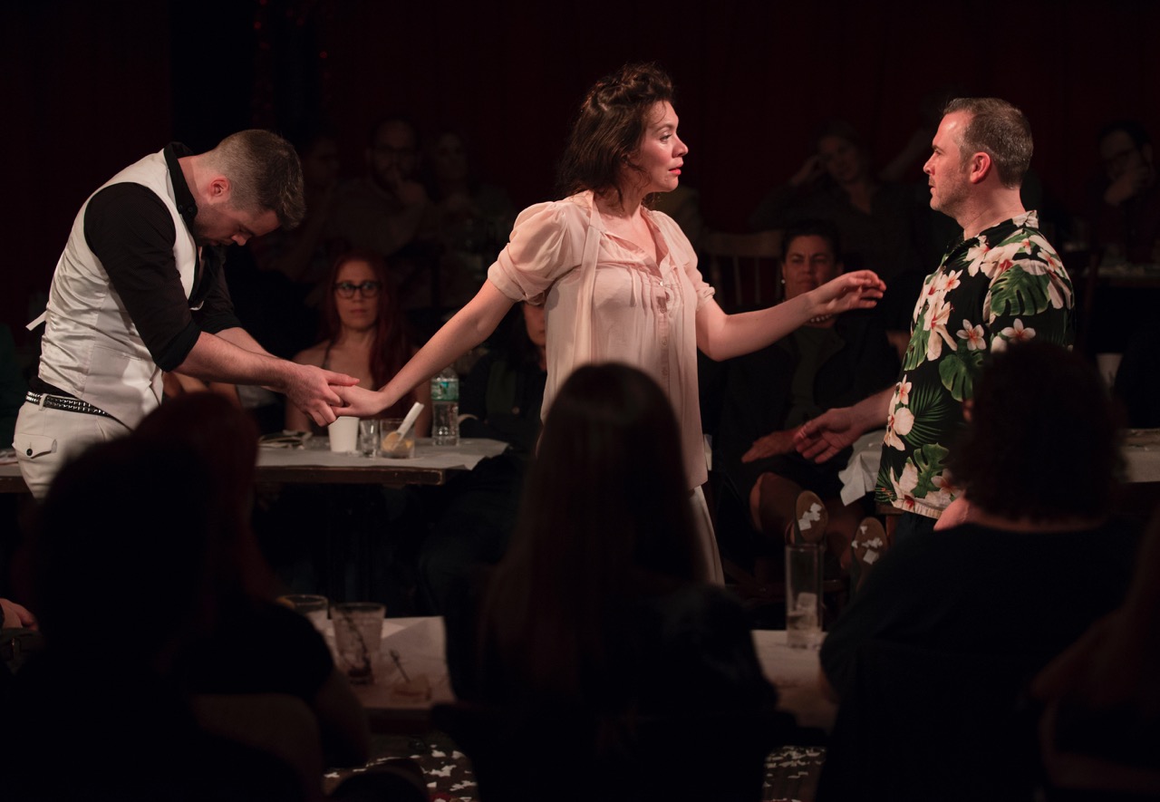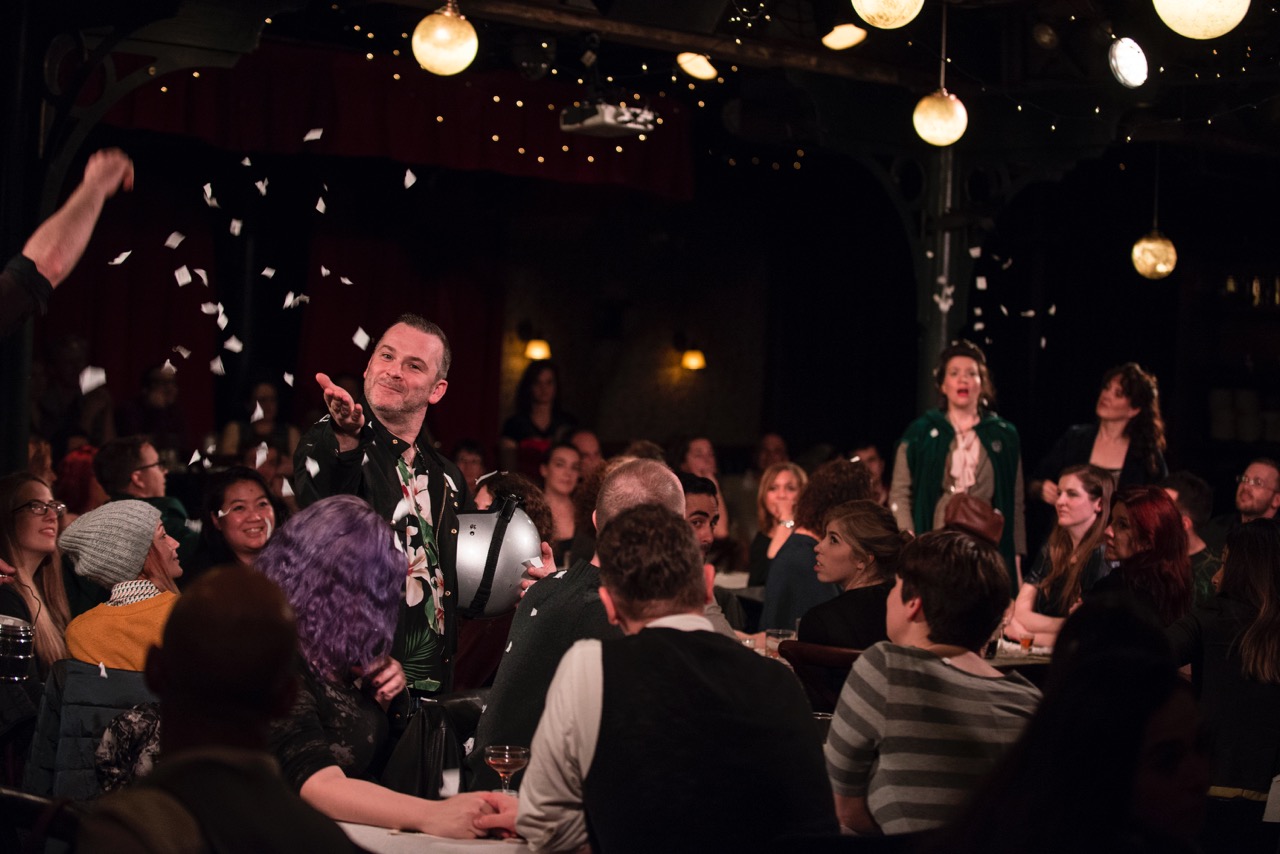 The National Theatre of Scotland has secured the perfect New York venue for its immersive play The Strange Undoing of Prudencia Hart: it has taken over The Heath, the bright tavern tucked away in a corner of the McKittrick Hotel. The McKittrick is the Punchdrunk theater’s elaborate Chelsea complex, where (elsewhere in its warren-like structure) the company’s noir-esque promenade show Sleep No More has been working its weird magic for the past five years. The McKittrick’s restaurants and bars have been designed to echo Sleep No More’s lost-in-the-attic beauty—so at The Heath, taxidermic wolves snarl in the rafters, fairy lights glimmer overhead, and there’s the deep glow of wood everywhere. When we enter, stamping sludge off our shoes, the Prudencia Hart cast is playing Scottish reels, and the staff sends us through the clutter of cloth-covered tables to the bar for our free shot of whiskey. The cold outside melts away; the sense of welcome is . . . extreme.