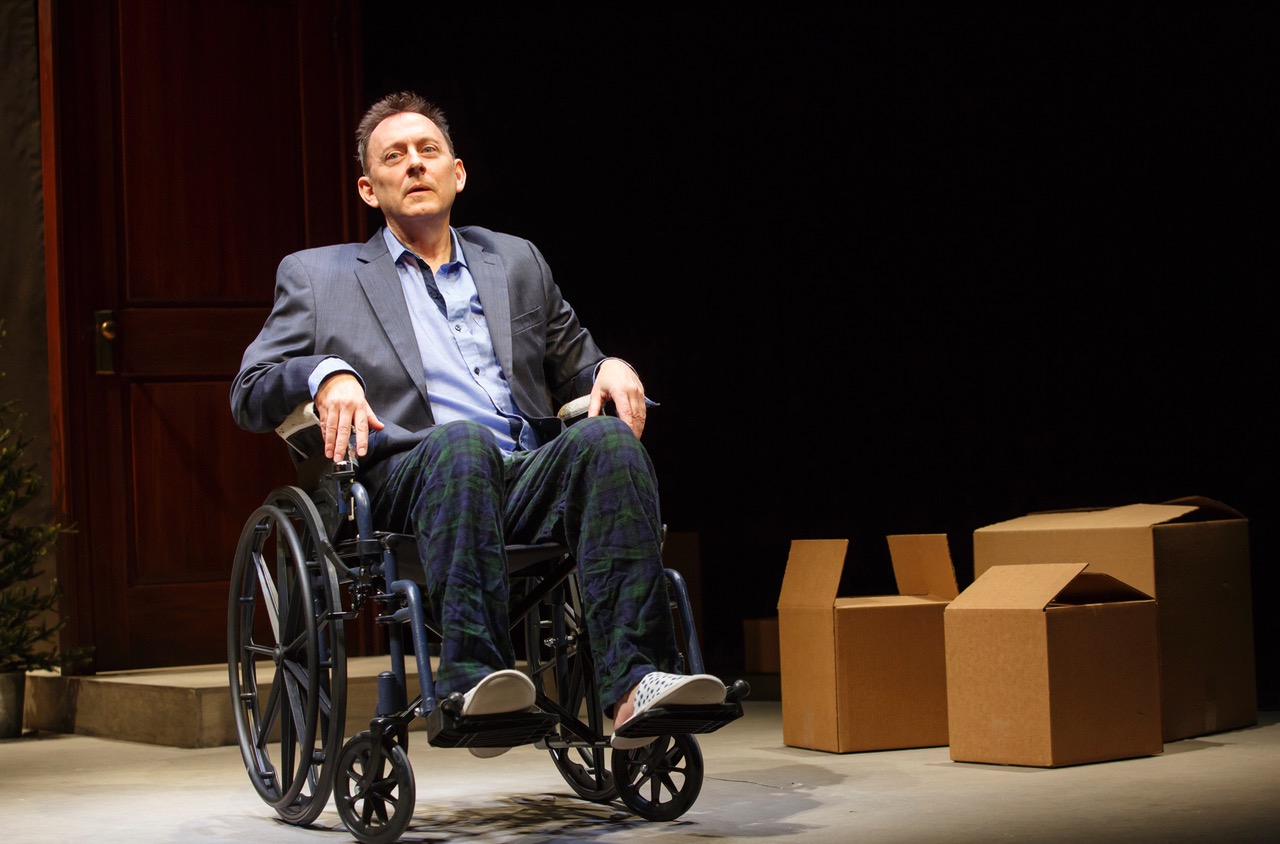 We first see the allegorically named Guy (played by Michael Emerson), dressed in only pajama bottoms, facedown on a beige carpet. He jerks up and stares at us. “Is it now?” he asks. “I thought I had more time.” There’s a swift blackout; lights up. And now Emerson is seated, a sports jacket on, nestled into a wheelchair and slippers.