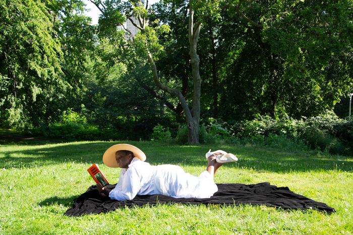 In her nudity Faustine also alludes to Sara Baartman, from South Africa, known as the Hottentot Venus, who was exhibited as a freak show in nineteenth-century Europe. Her large genitalia and buttocks were a curiosity to whites. In contrast to her nakedness, Faustine’s feet are clad in white heels (hence the series title). Paraphrasing the artist’s words, they symbolize church-lady pumps and the ever-present white patriarchy, colonialism, and domination. I interpret the white shoes worn in each photo as a means of movement and transport. They represent what Black women have been denied publicly and privately. Because of racism, misogyny, and more, what is often denied is agency. Faustine, in control of the camera and the lens, offers reclamation. In this case, as a photographer, she is a performance artist, historian, sculptor, shaman cutting across disciplines. She stages interventions that disrupt dominant narratives. She inserts Blackness in a momentous field of erasure. In the photograph They Tagged The Land With Trophies And Institutions From Their Rapes And Conquests, Tweed Courthouse, NYC, Faustine pushes against a monstrous white column symbolizing her and our continuous fight for justice. In I Like Tea With My Plato, she is dressed in white, with a regal scarf draped over her shoulder, drinking tea, reading a book, luxuriating on a great rock of the former free colony Seneca Village in Central Park. It is a balm for a people once forbidden to read.