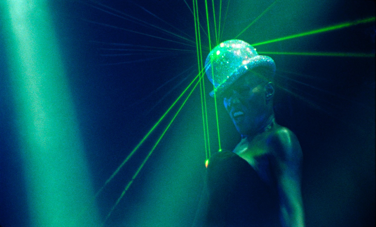 This is the rhythm of Bloodlight and Bami, tacking from disclosure to effacement, folksy verité to extravagance. It takes its cues from Jones herself, who is like a second director, one fluent in the language of mythmaking. The seasoned documentarian Fiennes has crafted collaborative portraits of eclipsing figures before, Slavoj Žižek twice. And though it is a predominantly suggestive text, Bloodlight and Bami counts as a didactic guide; Jones teaches the sensual politics of self-creation. Fiennes catches the change in accent that Jones, a pupil of Euro-cosmopolitanism, undergoes each time she travels: in Spanish Town, she slips into patois, and in Europe, she slurs in French. One of the film’s patterns finds Jones in a studio in Jamaica, recording for Hurricane with her longtime collaborators Sly and Robbie. She gripes about money not going through, and sometimes her graveled singing voice fumbles unintentionally. She incorporates the falters, when she performs onstage in sets of saturated light. And it is completely mesmerizing, watching Jones, in bustier and wimple, subverting her own masks. “I could perform in complete darkness,” she gloats over room-service breakfast in a swank hotel suite.