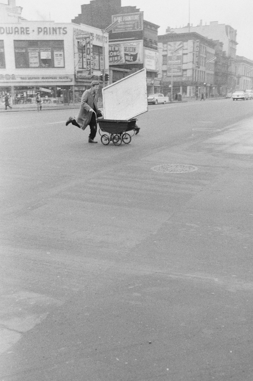 John Cohen, Red Grooms transporting artwork to Reuben Gallery, New York, 1960. Gelatin silver print, 10 × 6 3/4 inches. Image courtesy L. Parker Stephenson Photographs, New York.