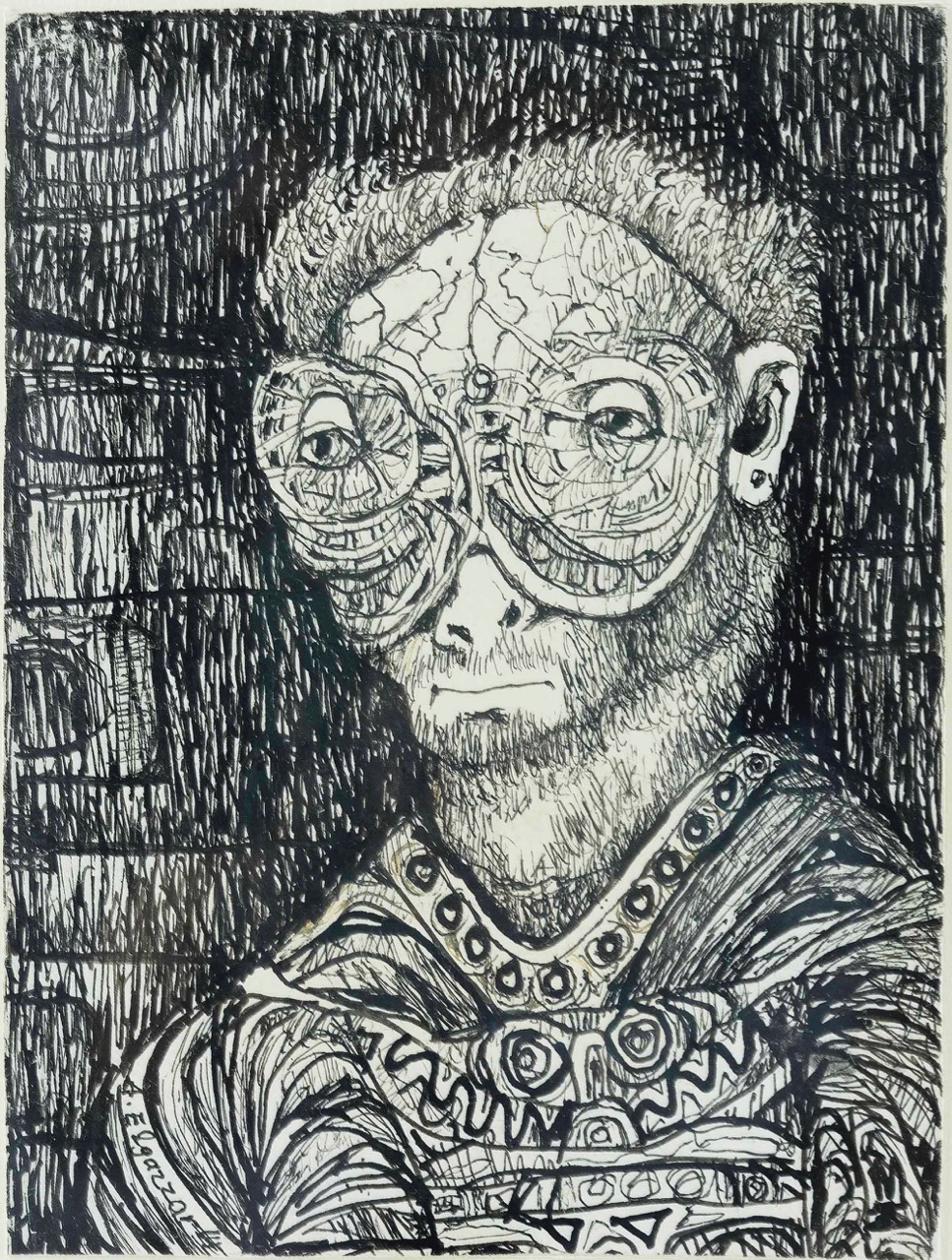 Abdel Hadi al-Gazzar was one painter in a trainful of artists selected in 1963 to visit the Aswan Dam, during its Soviet-funded construction in the south of Egypt. The trip was sponsored by Gamal Abdel Nasser’s revolutionary regime, which wanted Egypt’s finest to immortalize the president’s dazzling technological triumph over nature. By then, Gazzar certainly was considered one of the finest, if not the preeminent, painter of the new postcolonial state. As was to be expected, his resulting painting, the award-winning The High Dam (1964), was immediately celebrated by officials as an icon of the Nasserist era. But the Aswan experience also provoked a fantastical body of work that the artist largely kept private. His first India ink drafts of the scaffolds and cranes and pipes and machineries he saw there started out as sober visual chronicles of a sublime work site, but soon that sublimity would explode in his vision. Those machineries took on lives of their own, crawling spiderlike across the page and melding with impoverished human and animal forms. Then, a UFO alights to blast this whole invented world down (A Body Falling from the Sky, 1964); and now look, three wrinkled, pastel-colored alien beasts have materialized, whirling their eyes as they crouch beneath transparent membranes in a landscape punctuated by inexplicable equations (Falling Objects, 1964). Though Gazzar had employed futuristic imagery prior to Aswan, the style of these compositions is a world apart: they are claustrophobically covered with inscrutable details, webbed with a multitude of agonized lines, drawn by a cramped and manic hand.