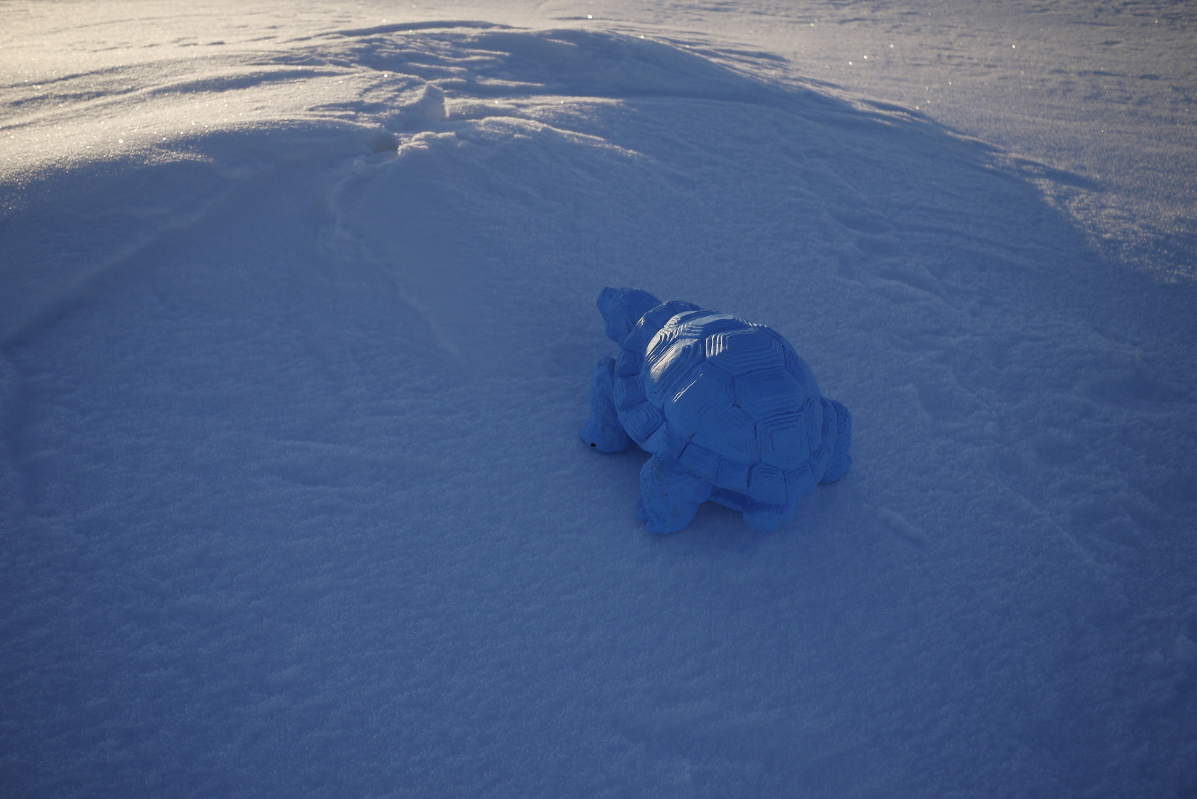 The more absurd, puzzling contributions also looked a little forlorn against the brilliant snow. French-Indian artist Nadira Husain’s Scrupulous (2020) is a clay turtle, of the commercial garden-gnome variety, that has been painted in periwinkle acrylic. In Hinduism, the turtle is an incarnation of the god Vishnu, who is charged with guarding creation; but Scrupulous is also, somewhat inexplicably, a nod to The Smurfs, Husain says. And Athens-based artist-collector Peter Niemann sent to the arctic Joseph Beuys’s legendary felt suit, slightly altered with the addition of a Marlboro patch to the jacket pocket; against a heavy purple sky, the empty suit drifts listlessly and inscrutably from the apex of a stick pyramid.