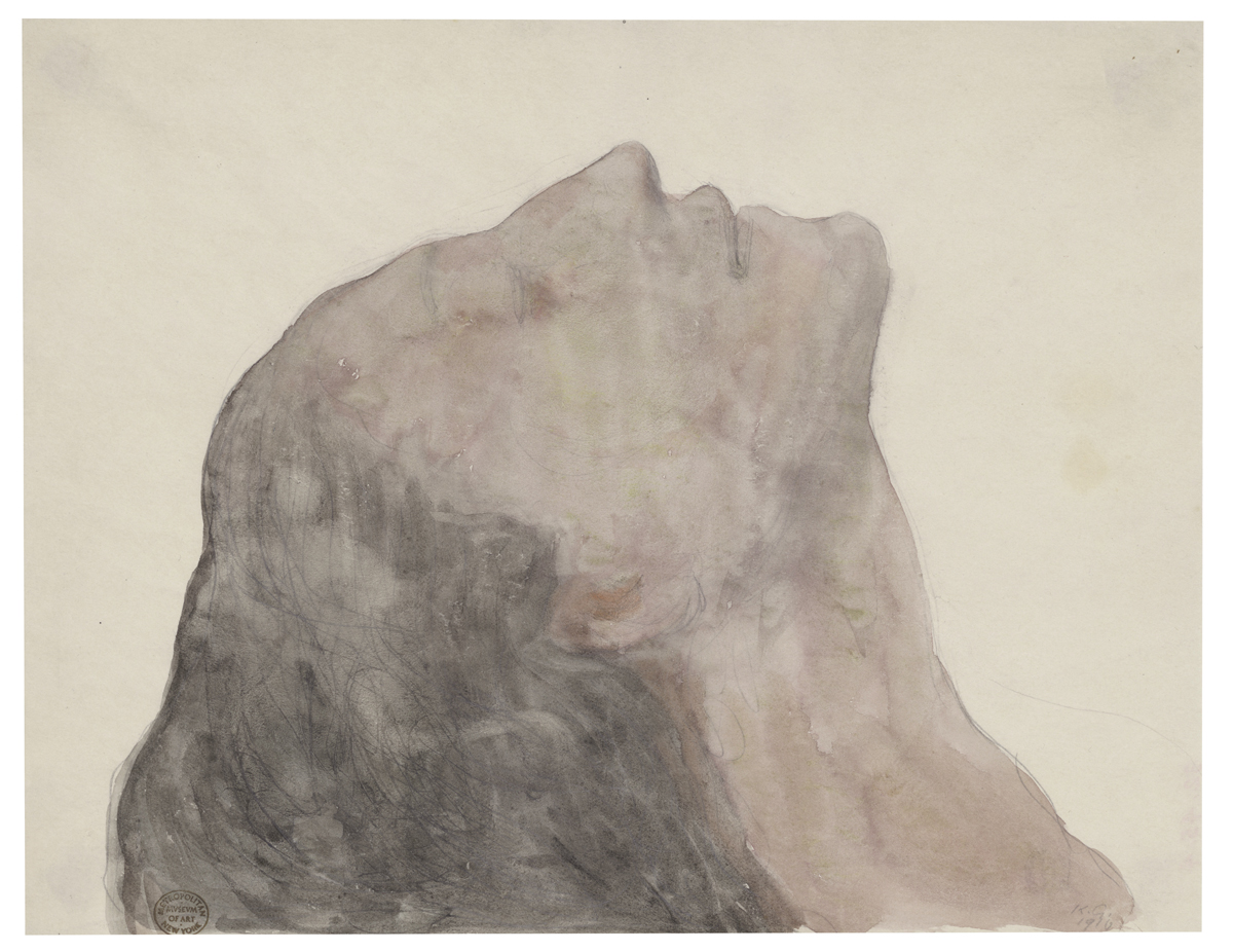 Despite his strategic self-fashioning, Gibran’s focus was not really on an East/West divide. His art indicates a desire to resolve binaries, to unify—to be spirit in the land; to be with his mother, Kamila; to be with God; to be whole after so long being split. Kamila passed away, still young, in 1903, shortly after the deaths of his older brother and younger sister. In 1916, Gibran made an eerie watercolor-and-pencil portrait of his mother at the moment of her death, Towards the Infinite. In her catalog essay, Lenssen interprets the work as capturing “with moving pathos the artist’s anxiety around survival . . . his impulse to mythologize precarity,” its solitary, attenuated visage “a membrane between presence and loss.”