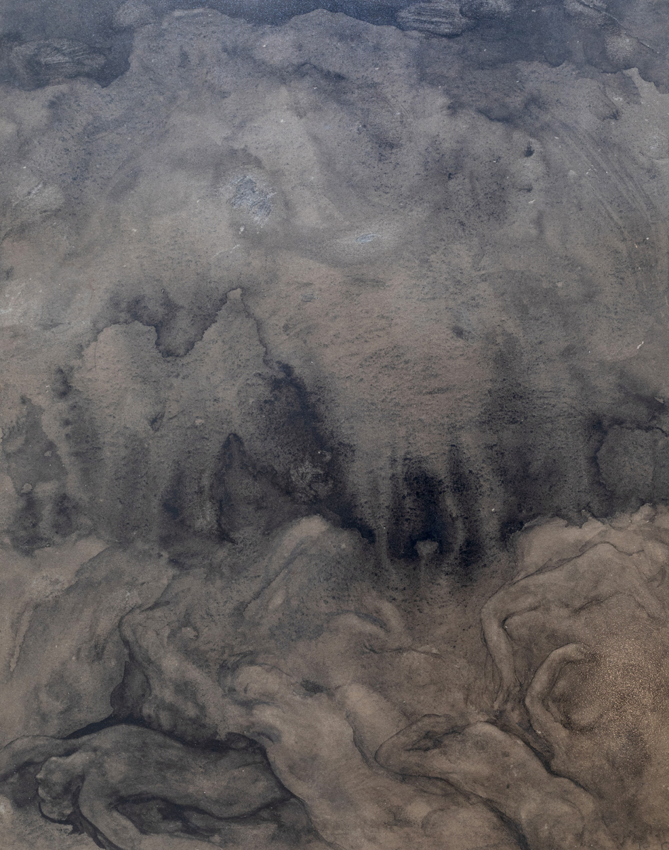 Gibran’s longed-for celebrity swelled after 1923. By then, his family was gone; the country he was born in no longer existed as such; his connection with his mother tongue had been severed; he could only be other than himself in his adopted country. In his Greenwich Village studio, he would hold on to his meteorite at night, clutching it in his hands while he slept, as if comforted by its solidity, as if fearing it might disappear anyway. He died, age forty-eight, in 1931, of the effects of alcoholism. One of the last works in this show, Human Figures Spread Out Below a Dark Landscape, is from the year prior. Its monochromatic picture plane is almost entirely abstract—rolling forms of felled bodies are barely visible at the bottom edge, beneath grisaille wash that erratically reels, muddles, transfuses; some areas look like peeling skin. It is his most lonesome work, and his wildest.