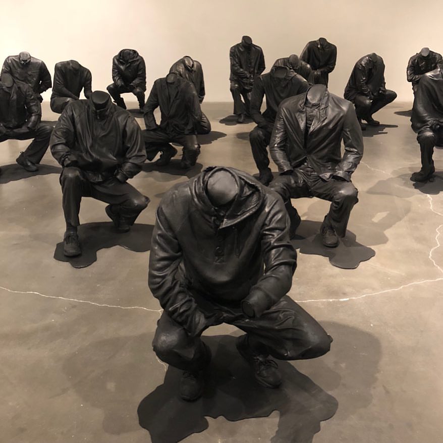 South African Haroon Gunn-Salie’s Senzenina (2018) is another heavy-handed statement. The focal point of the third-floor gallery, the work consists of an imposing group of headless monochrome men. Their bodies and clothes a uniform black, these eerie, life-sized figures crouch in the middle of the gallery. A nearby speaker emits recordings of explosions and protest songs. The wall label and catalogue essay inform us of the traumatic history behind the work—it is meant to recall the 2012 state-sponsored massacre of thirty-four protesters at the Marikana platinum mine in South Africa. It’s another memorial project crying out to remember injustice—but what does it actually do as an artwork? It’s a somber sight, to be sure, and one that will certainly unite viewers in their hatred of such horrifically brutal acts. But the sleek, perfectly executed sculptures are ultimately something defanged, less a provocation than an appealing form. It’s a history lesson, but it hardly amounts to sabotage.
