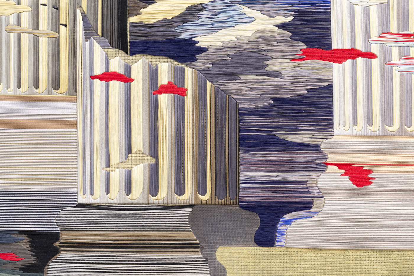 Nicolas Moufarrege, Le sang du phénix, 1975 (detail). Thread and pigment on needlepoint canvas, 50 × 64 inches. Photo: Hai Zhang.
