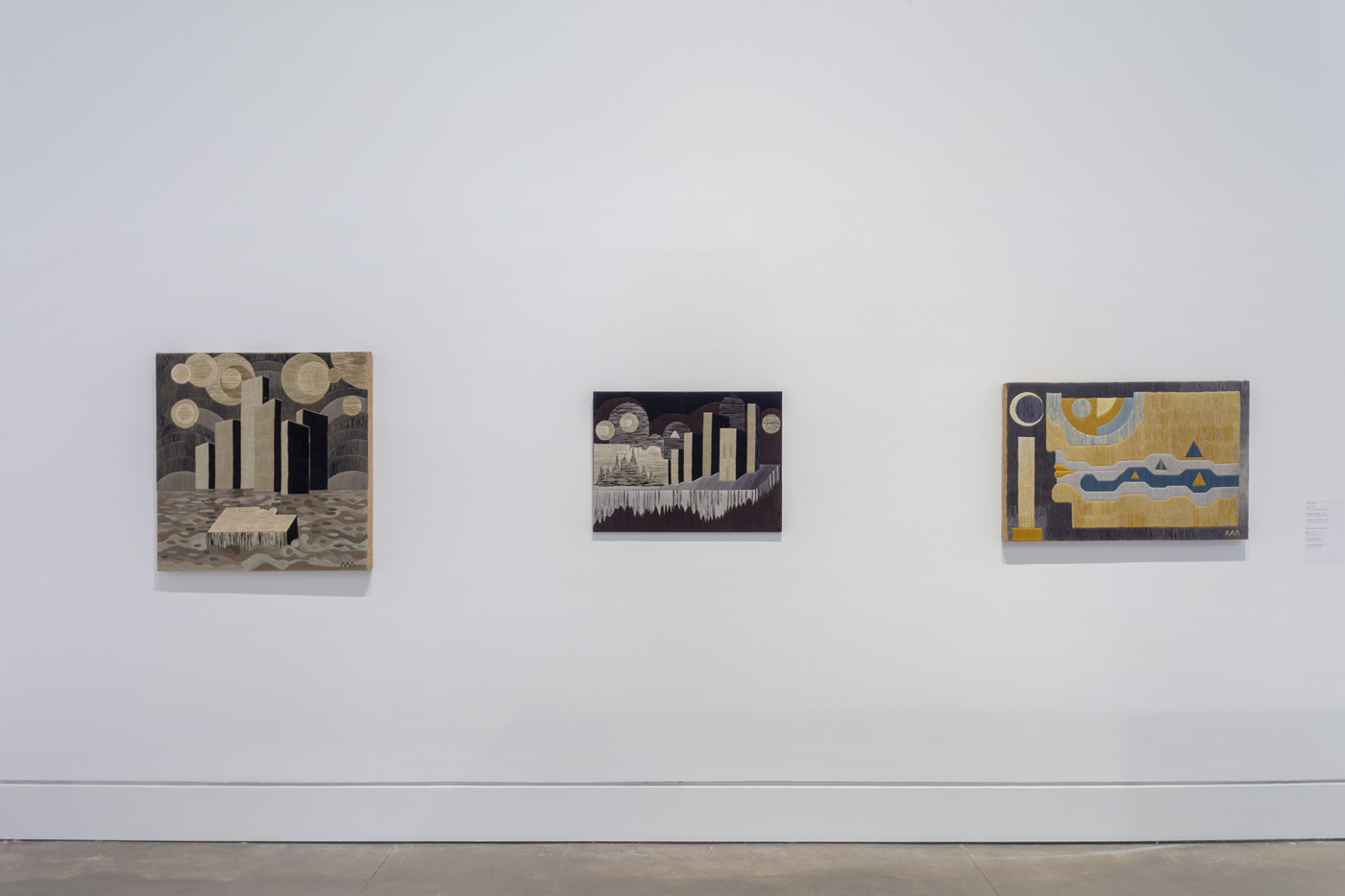 By the time he got back to Beirut, Moufarrege began to think of himself as properly an artist, his embroideries as “experimental weavings.” At the Queens Museum, three lap-sized pieces representing this period are dark and densely stitched, almost sculptural; they’re filled with mysterious buildings and surreal symbols: dreamy visages and floating moons. Moufarrege was showing these tapestries in unlikely spaces (a restaurant, a furniture showroom), and he also took a job working at the front desk of Triad Condas gallery, which quickly offered him a solo exhibition in 1973. But he wouldn’t be able to capitalize on this burgeoning success—at least not in Beirut. Lebanon’s traumatic, protracted civil war was beginning to smolder, and he decamped for Paris in 1975.