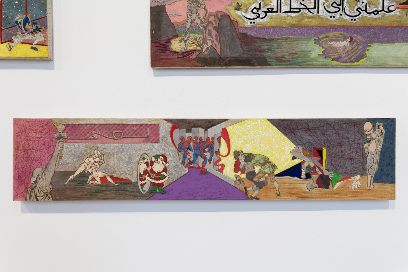 Moufarrege stayed in Paris for just a few years—though he was showing in more established commercial galleries now, he was broke, and had trouble with the immigration authorities (late-’70s France was marred by a brutal tide of xenophobia). He moved on again, arriving in New York City in 1981, where he lived on St. Marks Place in the Lower East Side, just in time for that scene’s apotheosis. In New York, Moufarrege started to take the ’80s predilection for appropriation to new levels, appropriating already-appropriated images to create antic, associative pictures of his own. There’s a suite of works on view that comically rip off Roy Lichtenstein, pairing that artist’s panels (already ripped off from DC Comics) with other iconic art historical images (by Yves Klein, Edvard Munch, Hokusai), all arranged in Mondrian-like blocks of painted color. And Moufarrege was incorporating more particularly American iconography: the Empire State Building shimmers in metallic thread in one small canvas that nods to Andy Warhol’s film of the same name; other, frieze-like bands are populated by characters such as a cartoonish Santa Claus or the Statue of Liberty, as well as Spiderman, who Moufarrege declared his avatar.