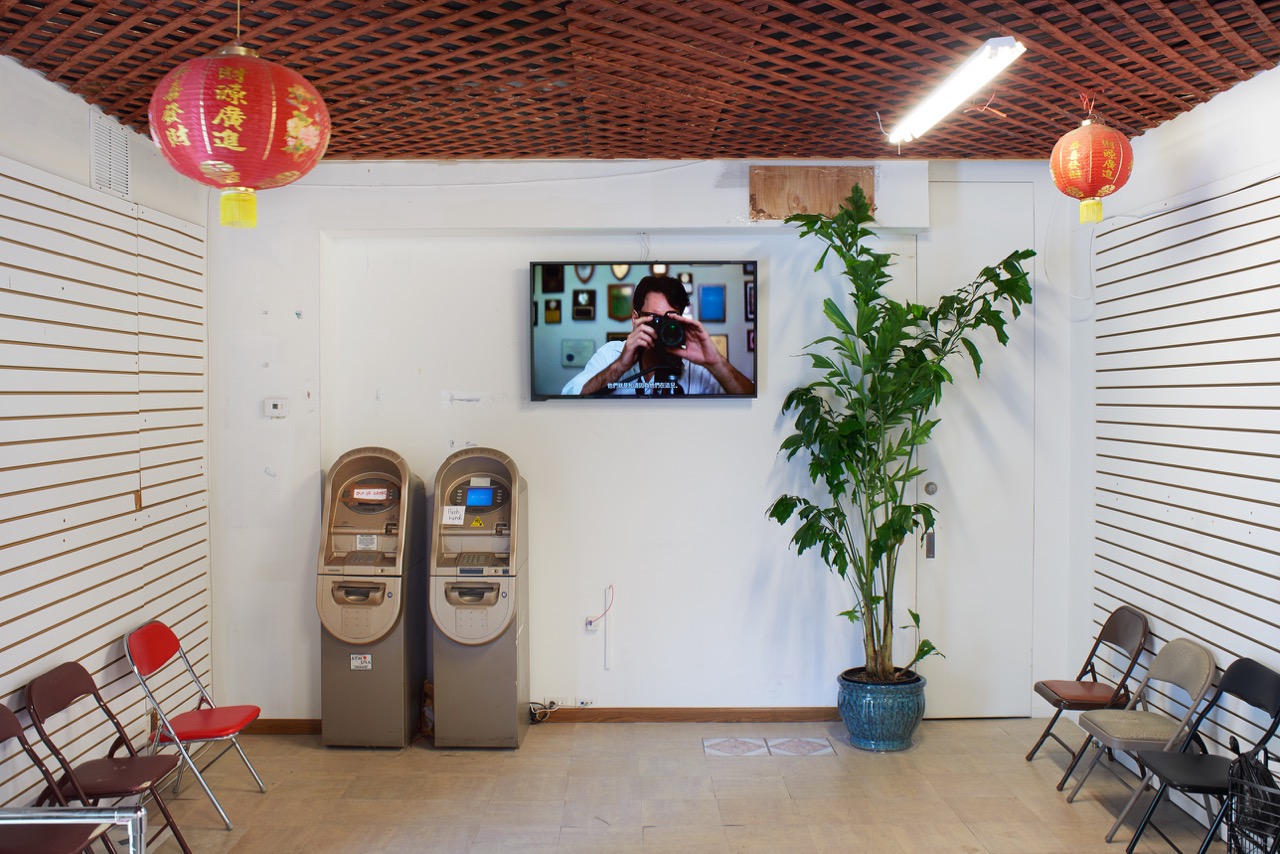 Next comes the trick of an authority figure telling you what you’re looking at. I imagine that many of the visitors are English-speaking art tourists coming to the fringes of Chinatown on the gallery circuit, and are likely already familiar with Fast’s maneuvers (and have probably read the press release online). But for those whom the artist perceives as “local,” there is a statement written in Chinese characters displayed on an LCD screen mounted high up on the right-hand wall. Along with some rather flat-footed, ambivalent art-world gesturing toward the process of gentrification, the statement informs them: “This space is not real. It is a gallery exhibition space.” (It must be noted that the simulated shop isn’t only confusing for Chinese-speakers. For a first-time visitor to the gallery such as myself, the set-up was disorienting to the point that I missed the exhibition altogether the first few times I walked by, until, with mounting panic in my chest, I peered in through the glass door and noticed a fancier-than-usual computer where a cash register should be.)