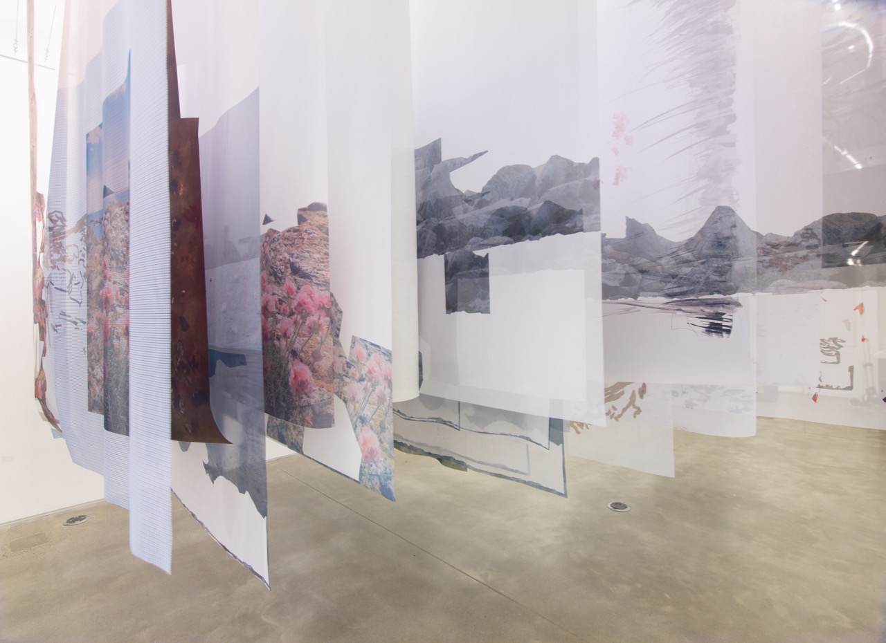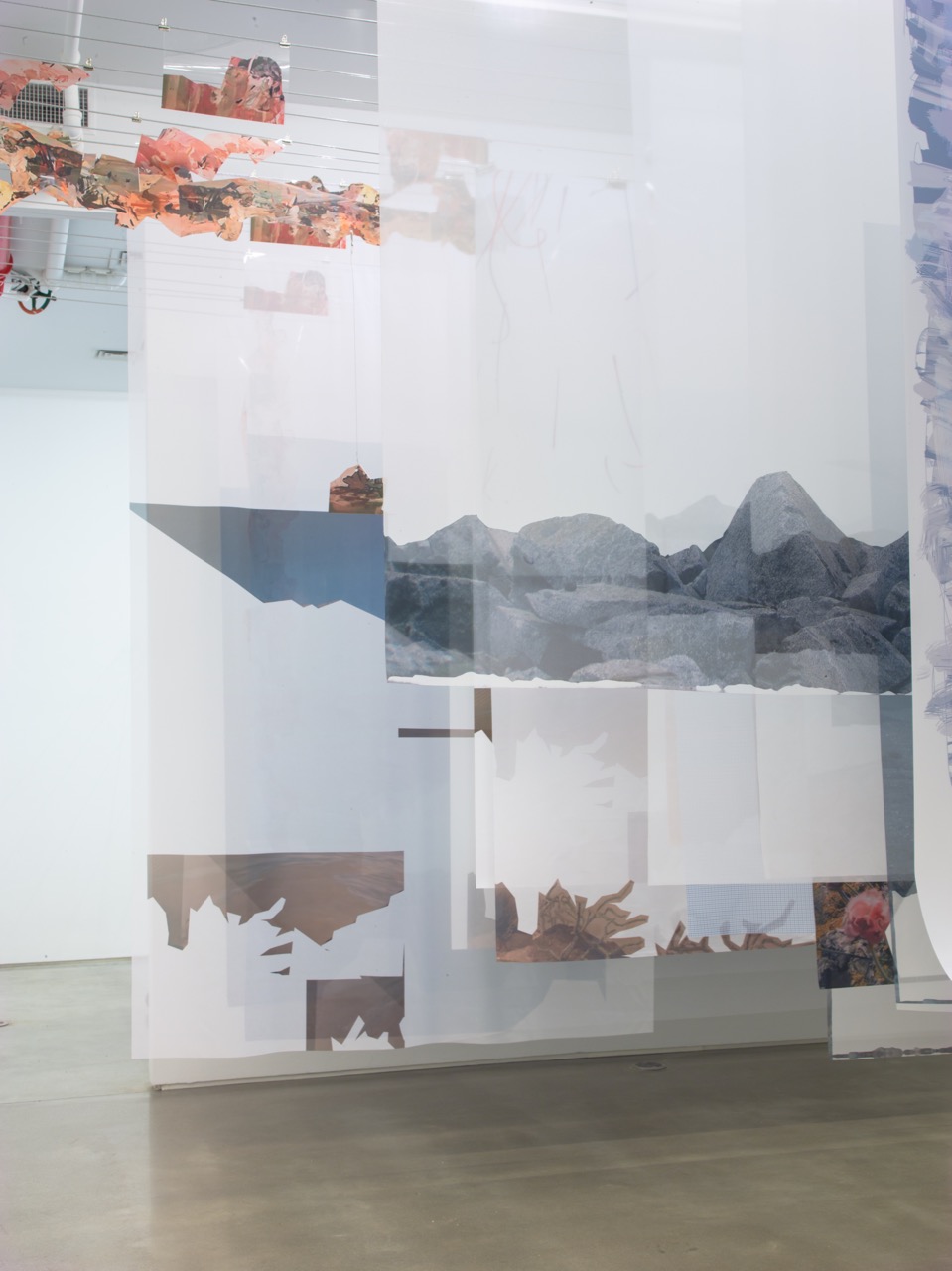 This is also to say that the work is hard to see. In the first room, facing the installation head-on, the thickly opaque sheets block the ones behind; only a few layers can be glimpsed at once. The sheets are hung close together, so that one has to crane and peer to view the images printed on them. Or they are hung so high up that one has to concentrate to make them out. I found myself using the camera on my phone to gaze bionically, zooming in through my screen on details that were difficult to otherwise descry. The images in question make up a field of isolated painterly gestures: a commotion of shaky lines on one panel, a smudge of repeated marks made using a special Photoshop brush on another. Some layers are simply flooded with color: a hit of toxic orange or strip of lucent blue. There are also found photos manipulated in different ways—grayscaled clusters of roses, a collaged wall of rocks. Passing through the room, all the different marks and icons come in and out of focus, merge and separate in your field of vision.