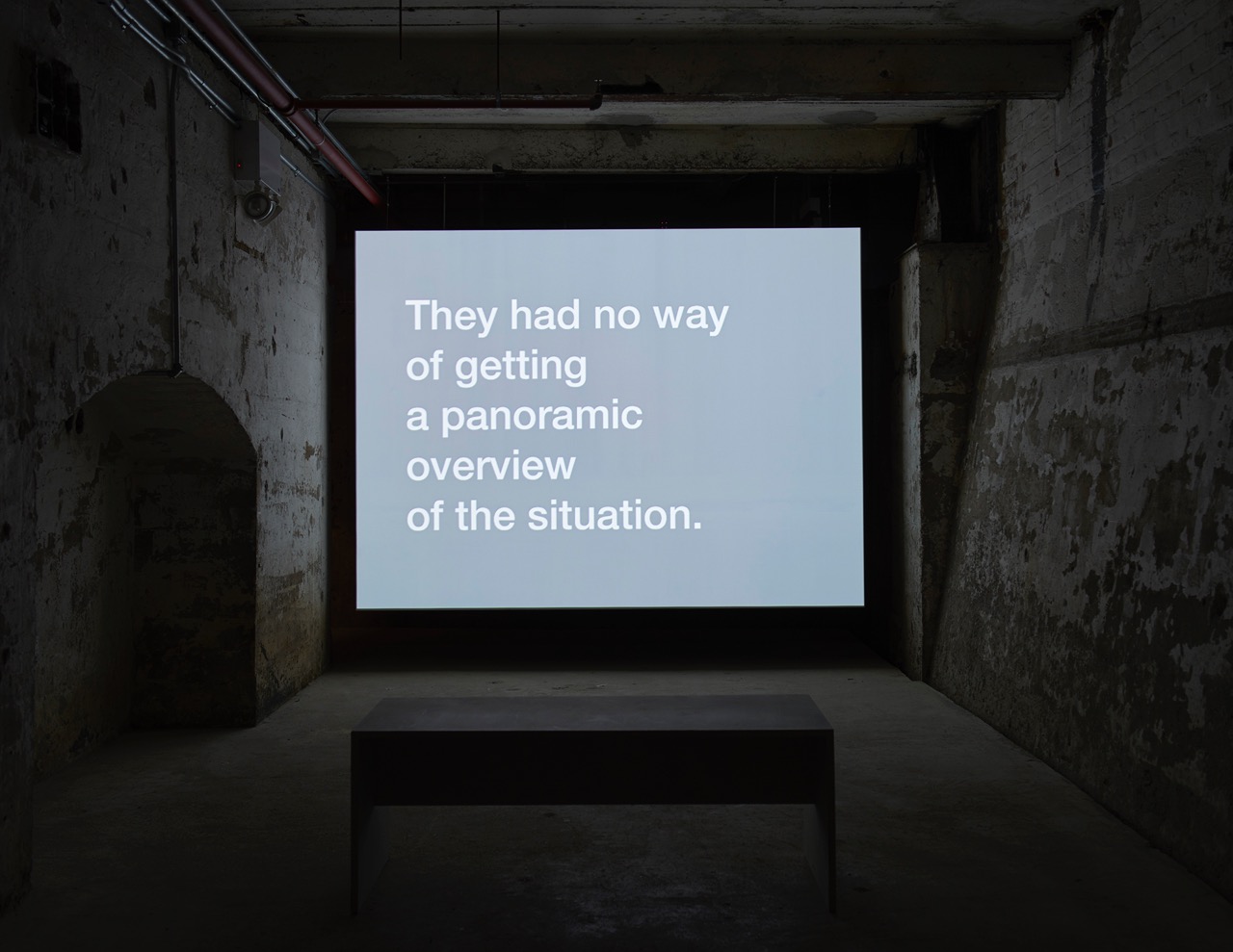 Tony Cokes, Evil.27.Selma, 2011 (installation view). Courtesy the artist and Greene Naftali, Hannah Hoffman, and Electronic Arts Intermix. Photo: Kyle Knodell.