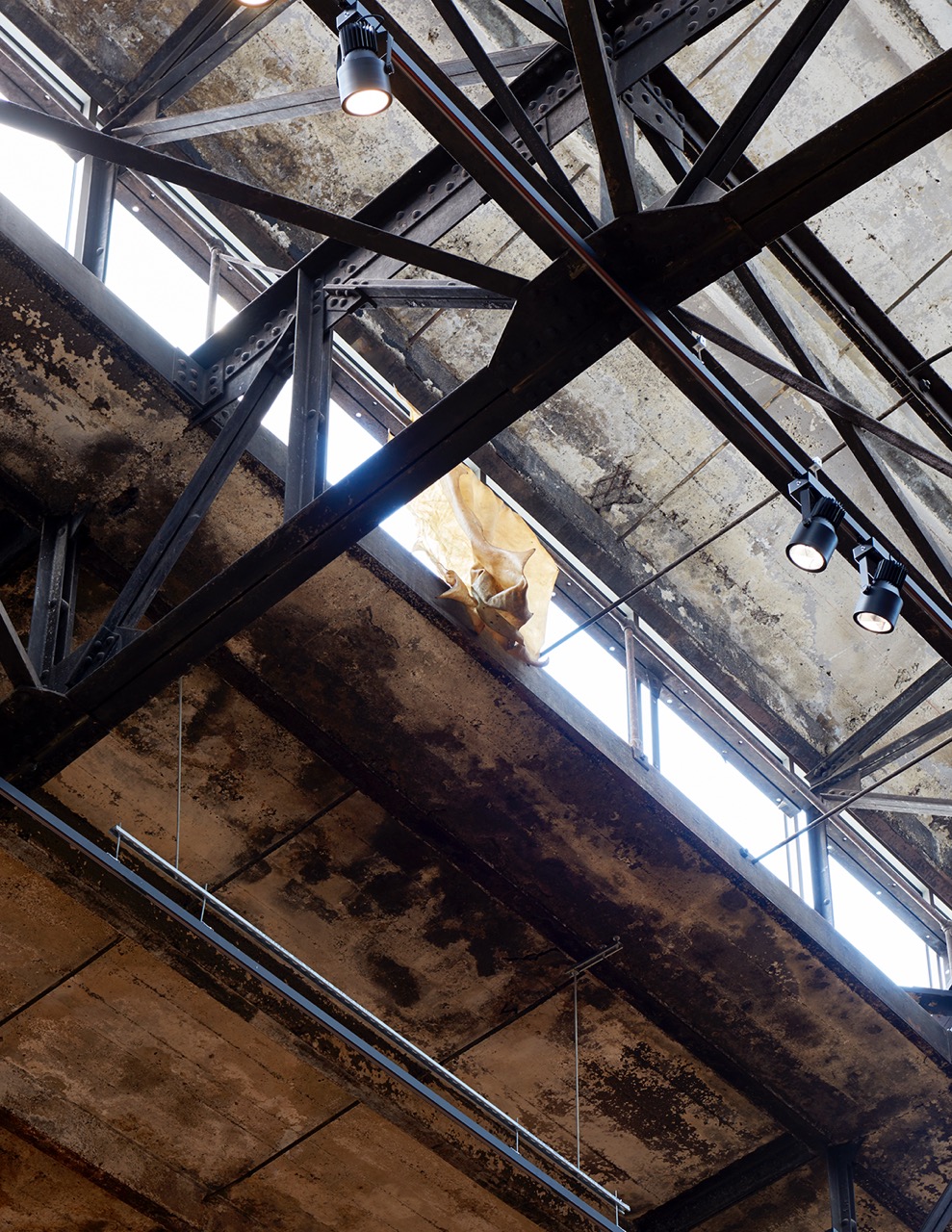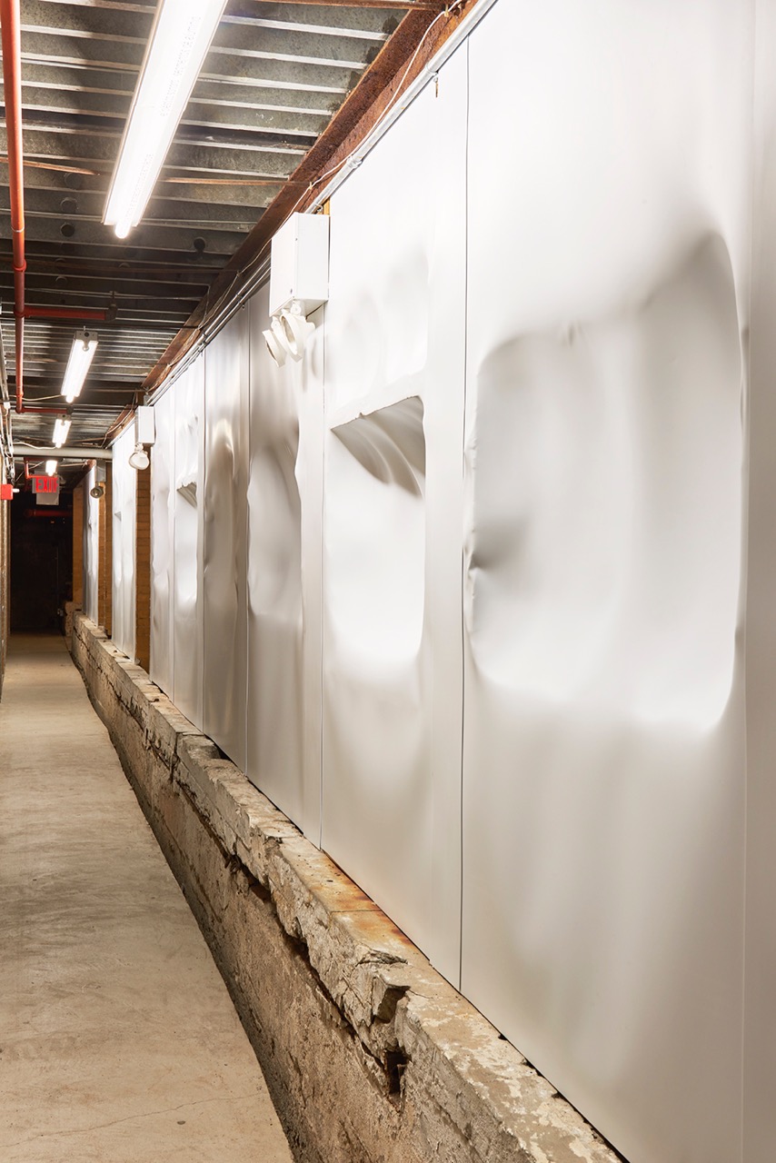 It takes careful and attentive listening to hear nothing; likewise, the exhibition as a whole requires careful and attentive looking, which sometimes involves a hunt for the artwork indicated on the exhibition map—another form of erasure, perhaps: the obviation of how we’re used to looking at an exhibition. Back downstairs, I stupidly wandered up and down one of the labyrinthine basement’s corridors, hunting for Rafael Domenech’s Tactics for a new architecture (excerpts from Severo) (2019), until I finally noticed one wall was discretely covered with a white Styrene skin. I didn’t think to gaze upward, but instead had to be told that the artwork continued on the ceiling, where vinyl letters are stuck onto long tubes of harsh fluorescent lights to create a poetic and oblique narrative in Spanish and English (these lightbulb-poems are also found at the top of the stairwell going back to the first floor). Also on the first floor, a glazed pottery by ektor garcia (tocado, 2019) hides atop a doorway; and way up high, close to the soaring ceiling, a sensuous piece of dirt-smudged rawhide dangles from the clerestory windows: Rindon Johnson’s The stage is no place for the riot (ongoing). You have to look around and crane your neck and squint to see some of these artworks—there is no pretense of a neutral, standardized act of viewing. You are acutely aware of yourself as you try to see.