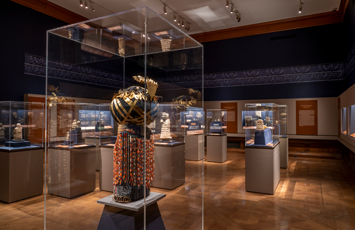 She Who Wrote: Enheduanna and Women of Mesopotamia, ca. 3400–2000 BC, installation view. Courtesy the Morgan Library & Museum. Pictured, left foreground: Queen Puabi’s funerary ensemble, Mesopotamia, Sumerian, Ur (modern Tell el-Muqayyar), Puabi’s tomb chamber, on Puabi’s body, Early Dynastic IIIa period, ca. 2500 BC. Courtesy the Penn Museum.
