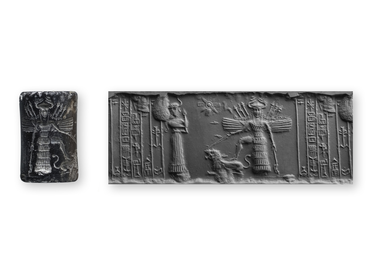 Cylinder seal (and modern impression) with goddesses Ninishkun and Ishtar, Mesopotamia, Akkadian period (ca. 2334–2154 BC). Courtesy the Oriental Institute of the University of Chicago.
