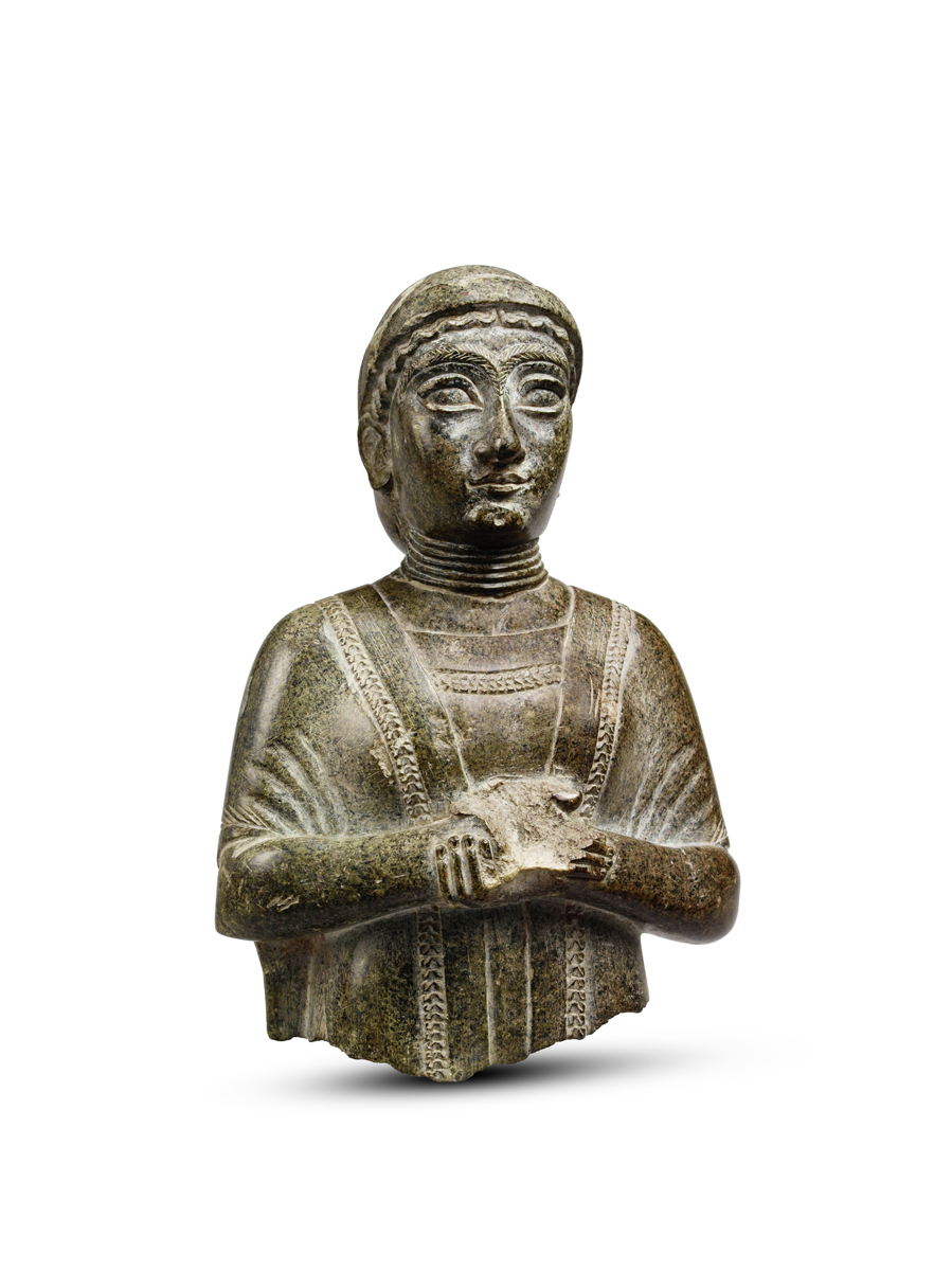 Fragment of a standing female figure with clasped hands, Mesopotamia, Neo-Sumerian, Girsu (modern Tello), possibly the reign of Gudea, ruler of Lagash, ca. 2150 BC. Photo: Thierry Olivier. © Musée du Louvre, RMN-Grand Palais / Thierry Olivier / Art Resource.
