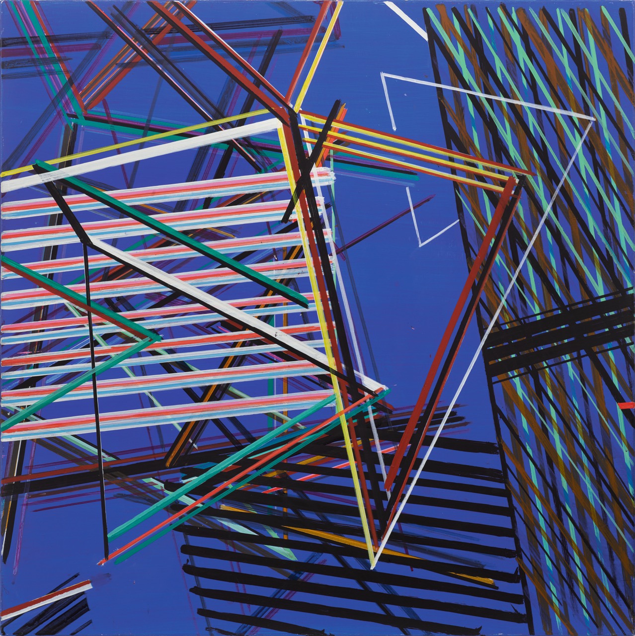 Boullata’s prints point to another tie that binds across the show: a predilection for geometric abstraction, which Palestinian artist Samia Halaby, for instance, steadfastly studied in the late 1960s. Here, her stunning and contemplative White Cube in Brown Cube (1969) toys with our depth perception, the radiant white square in the center of the canvas seeming to float toward us, impossibly casting a shadow onto the deceptively deep ground of soft amber behind it. A splendid optical game of advancing and receding planes is also at play a few feet away in Untitled (Kitty Hawk) (1980) by Beirut-born Nabil Nahas; his canvas is covered in a riot of dynamic lines and angles layered atop a galvanic cobalt blue, the whole seeming to pump with the adrenalized exhilaration of flight alluded to in the title.