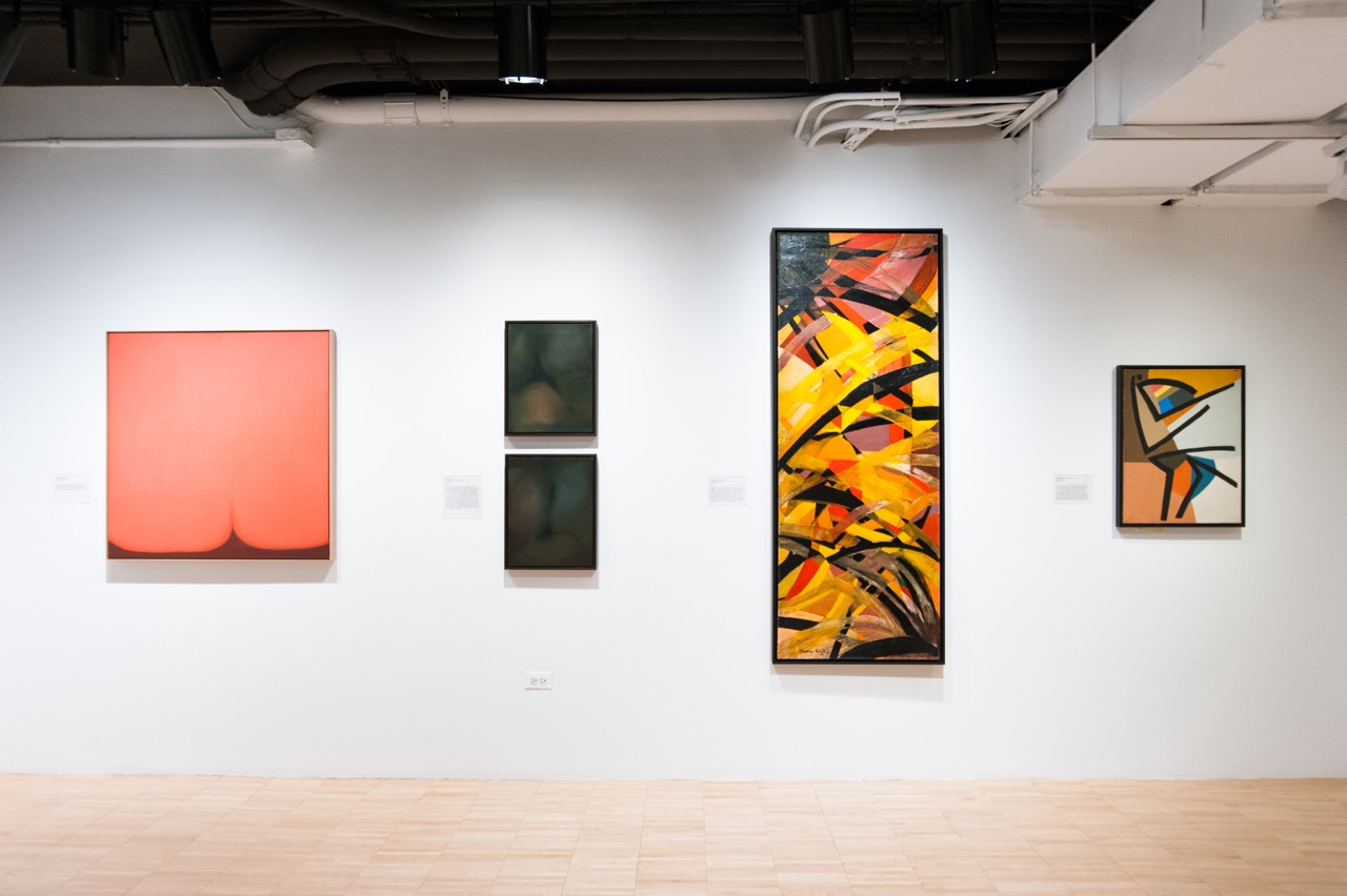 Taking Shape: Abstraction from the Arab World, 1950s–1980s, installation view. Photo: Nicholas Papananias. Image courtesy Grey Art Gallery, New York University. Pictured, far left: works by Huguette Caland and Afaf Zurayk.