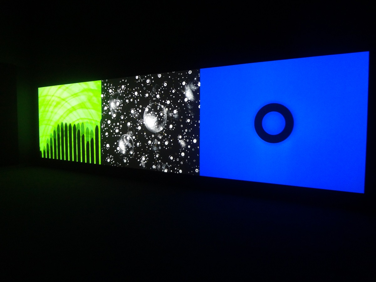 This model of environmental, multi-projector performance was pioneered four decades before in such works as Oskar Fischinger’s Raumlichtkunst (Space Light Art, 1926/2012), on view nearby. Painstakingly reconstructed by the Center for Visual Music from films more than half a century old, this three-screen video installation is a kinetic abstraction of psychedelic color and intensity, contrasting geometrically thrusting bars with centrifugally collapsing folds, as central images of the cosmos evoke the infinite.