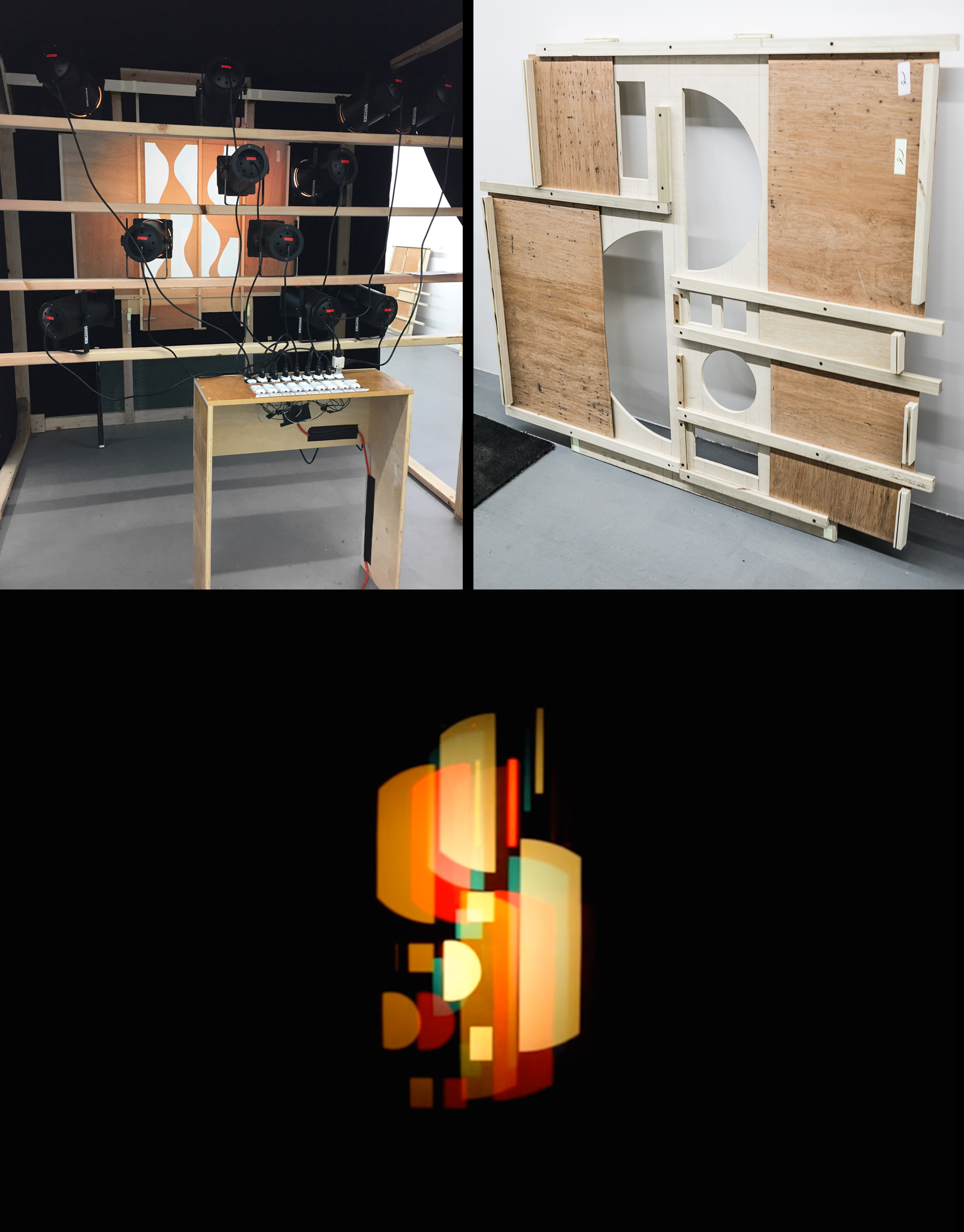 Kurt Schwerdtfeger, Reflektorische Farblichtspiele (Reflecting Color-Light-Play), 1922/2016. Constructed by Daniel Wapner, performed by Lary 7, Bradley Eros, Rachael Guma, and Joel Schlemowitz at Microscope Gallery. Image courtesy of Microscope Gallery and the Kurt Schwerdtfeger Estate.
