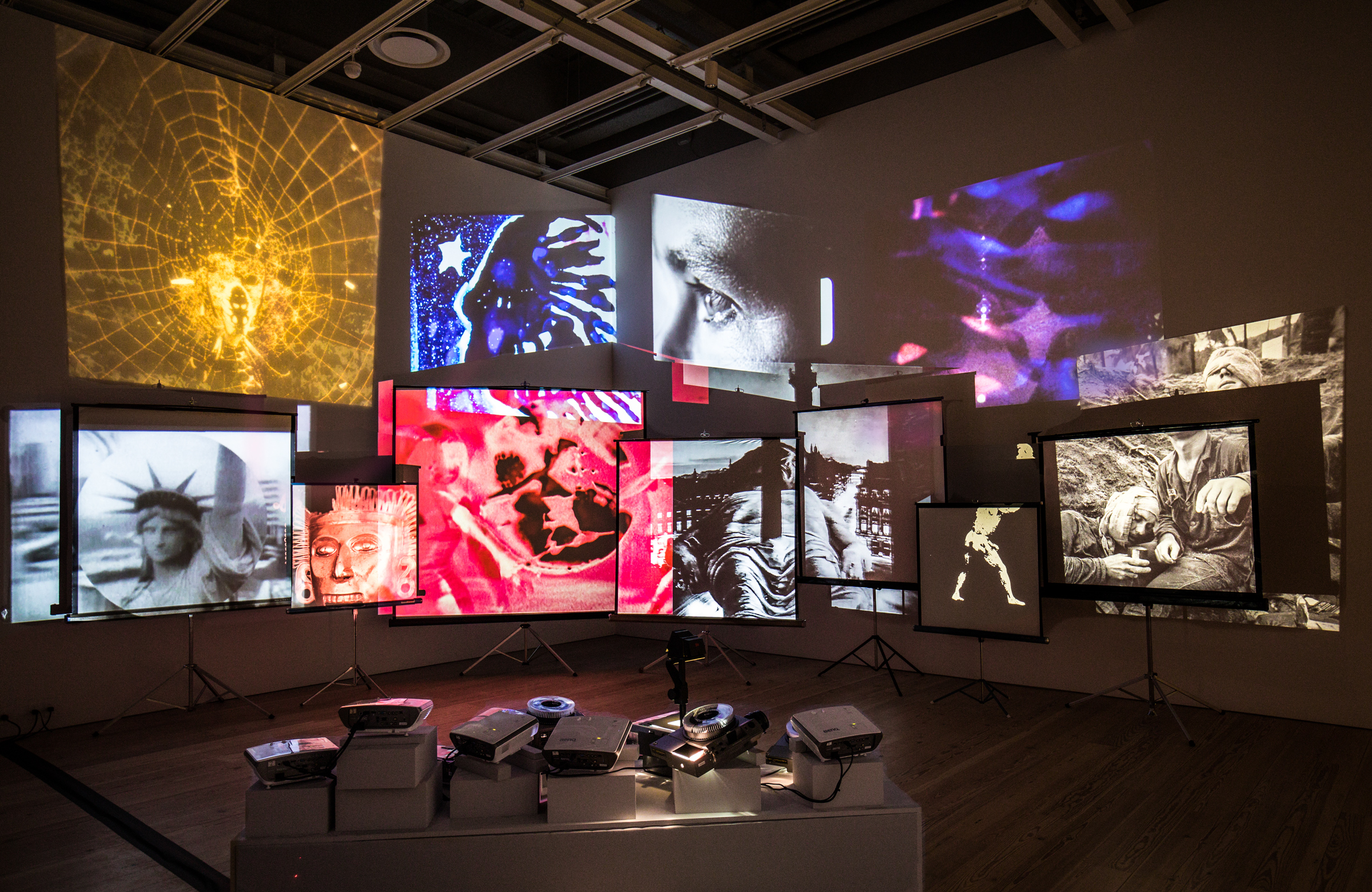 Stan VanDerBeek, Movie Mural, 1968. Multiple 35 mm and 16 mm films transferred to video, with black-and-white and color slide projections. Image courtesy estate of Stan VanDerBeek. Photo: Andrew V. Uroskie.