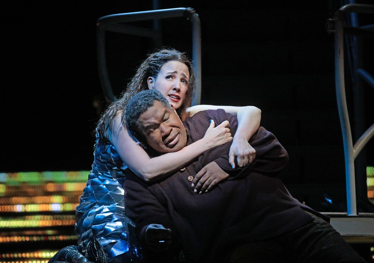The biggest drawback of the production stemmed from the singers’ restricted ability to move about—a limitation all but dictated by the narrow, horizontal strips of ground between the strings of LED lights. For most of the evening, the characters were hoisted and twirled around, above that field of lights, on a large, swiveling machine that looked like a cross between a ship’s gangway and some platform on a movie spaceship. In Owens’s first scenes, he seemed a bit less powerful than I remembered him from past engagements, and I feared that Lepage’s intricate staging was cramping the singer’s style. Fortunately, before the first act was over, his performance had stabilized.
